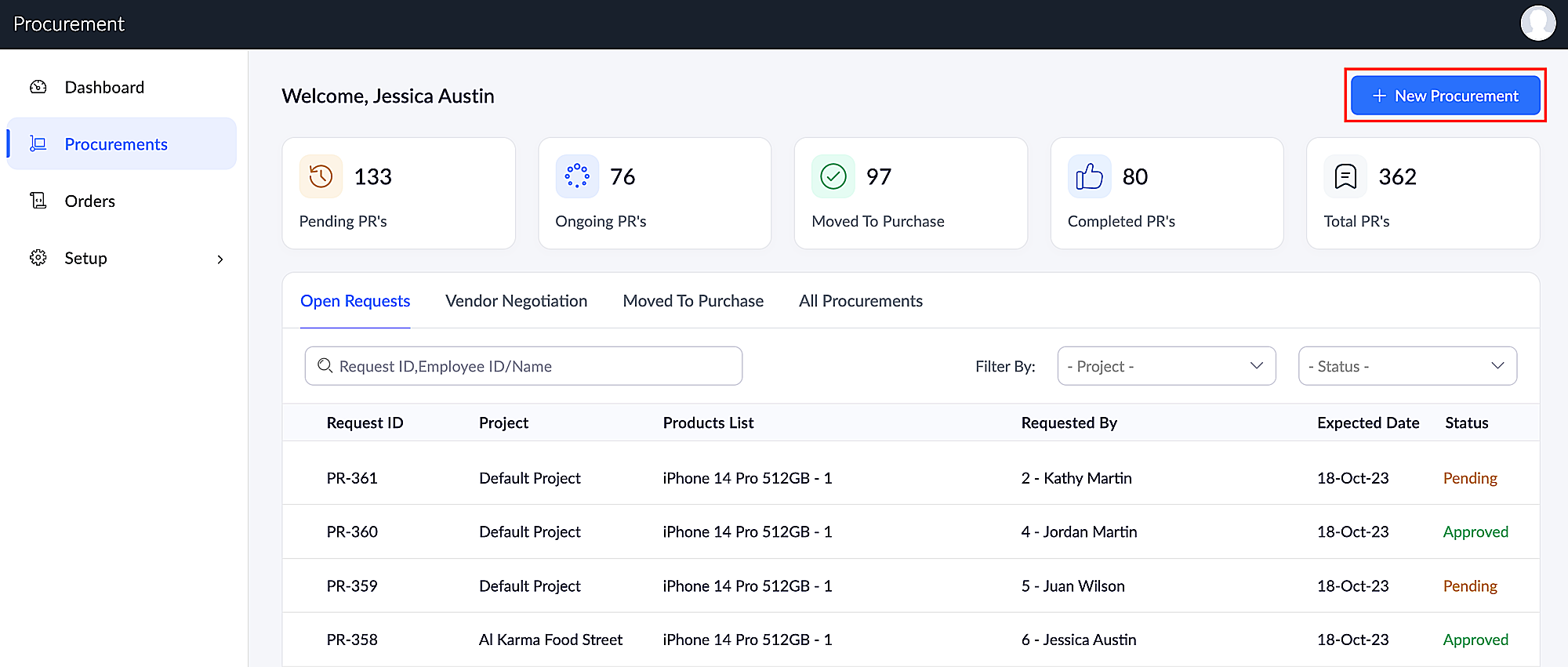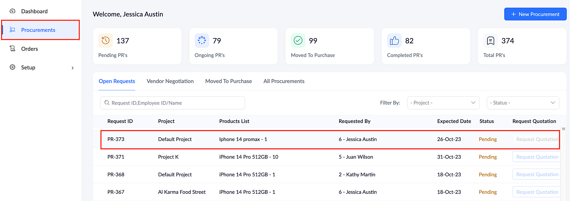 新しく作成されたPRは、調達ダッシュボードに表示されます。