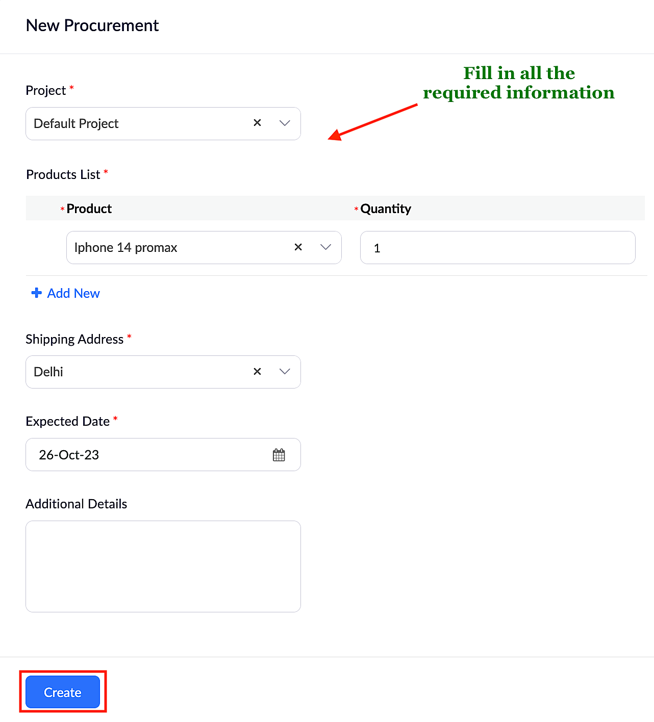 3. 新規調達ページで、すべての必須情報を入力し、作成をクリックします。