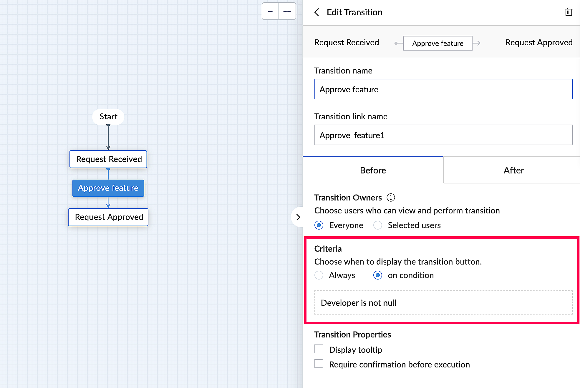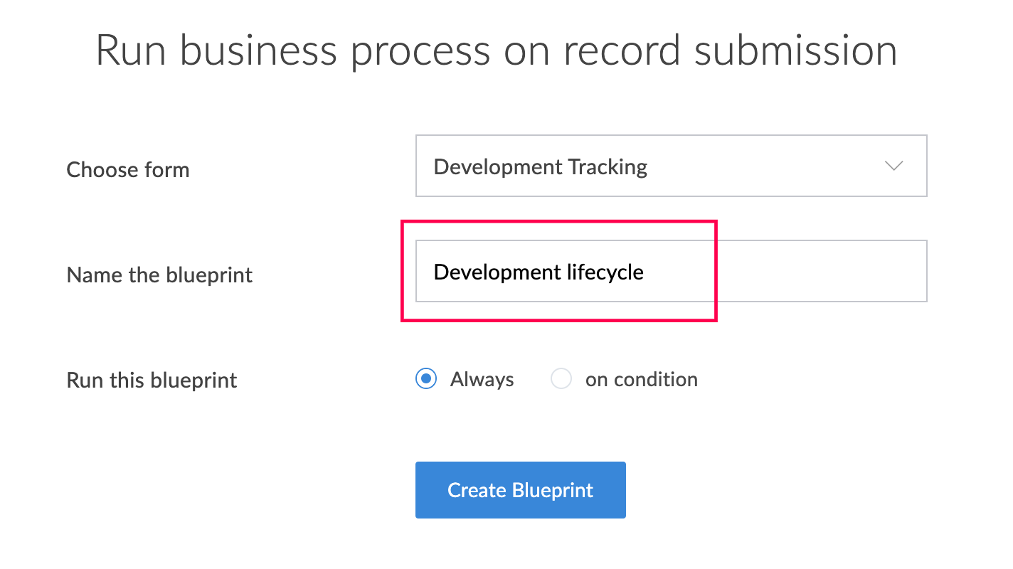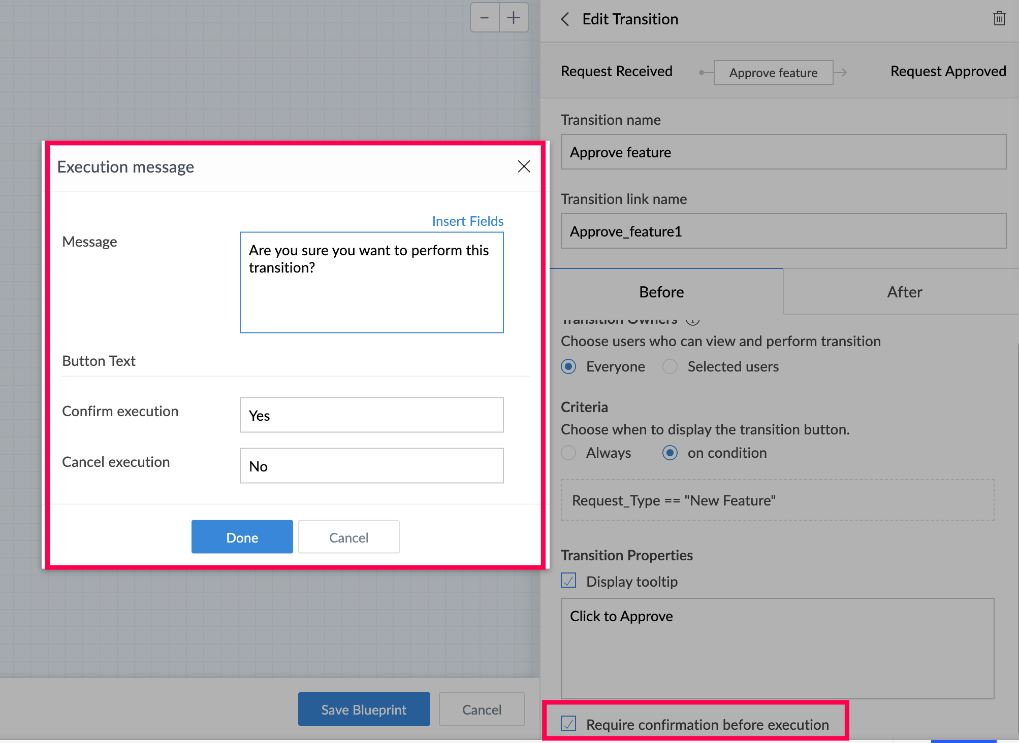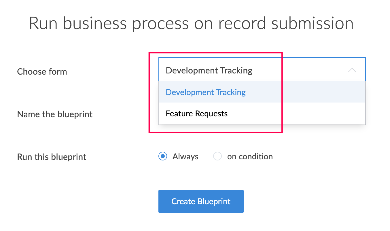 • 条件の定義 - Blueprintは条件に基づいて実行できます。 例えば、受領済みリクエストの種類が「新規 機能要望」の場合のみブループリントを有効にし、機能開発の進捗管理を行うシナリオを考えてみましょう。