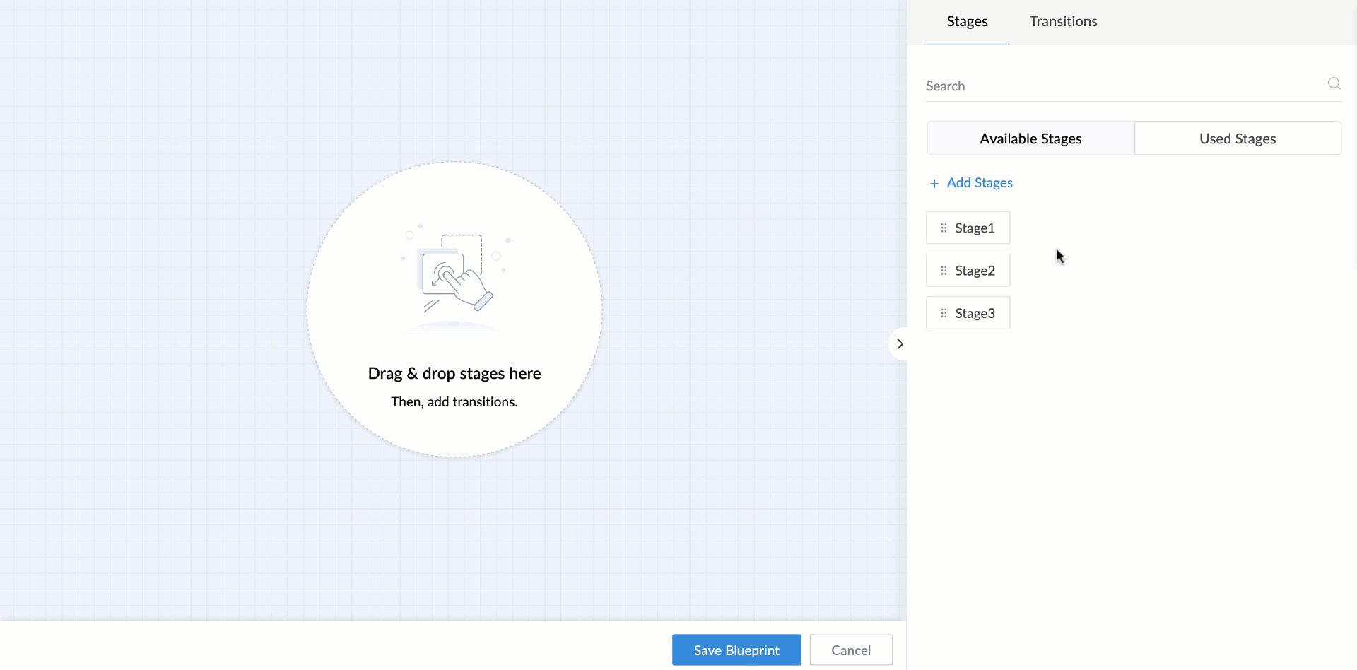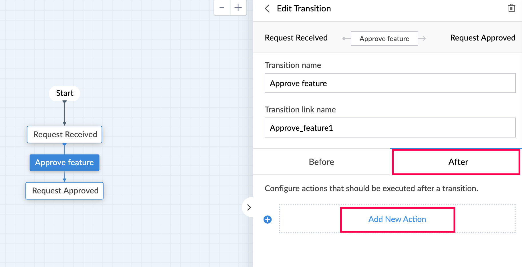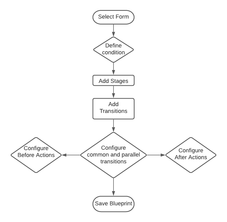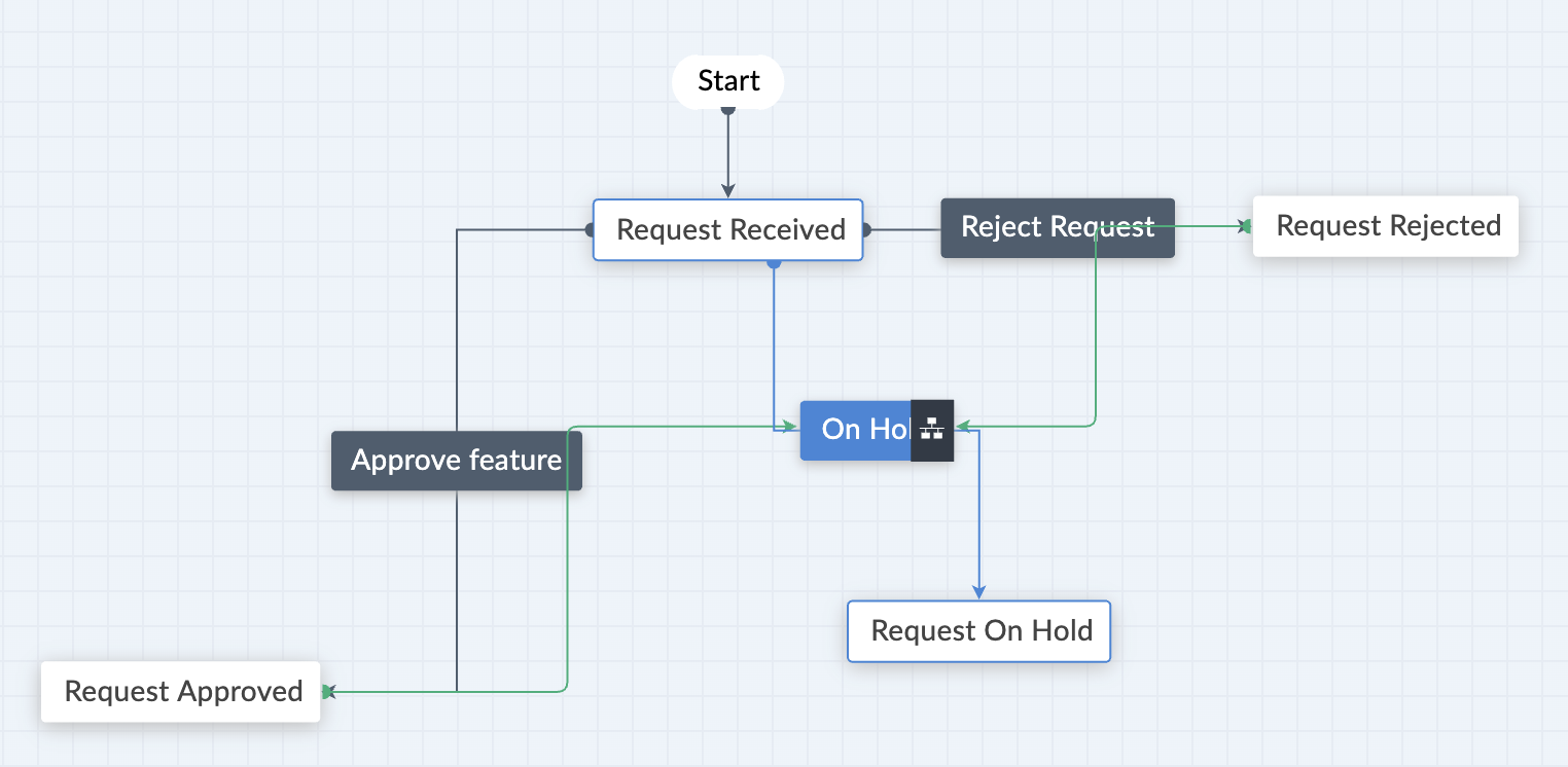 手順 4: transitionsの追加 - これらは中間フェーズで、2つのステージ間のリンクの役割を果たします。 Transitionはクリック可能なボタンで、 blueprintを次のステージへ進める際に使用します。 同じ例を用いると、 承認する Feature Development Started、および 課題 Found などがtransitionsの一例です。 承認する Feature」のtransitionが実行されると、blueprintステージはRequest 承認済み」ステージへ移動します。