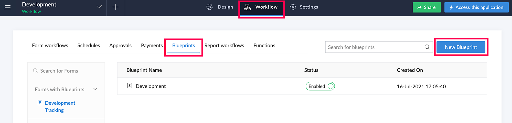アプリケーションで ワークフロー > Blueprints > 新規 Blueprint へ移動します。