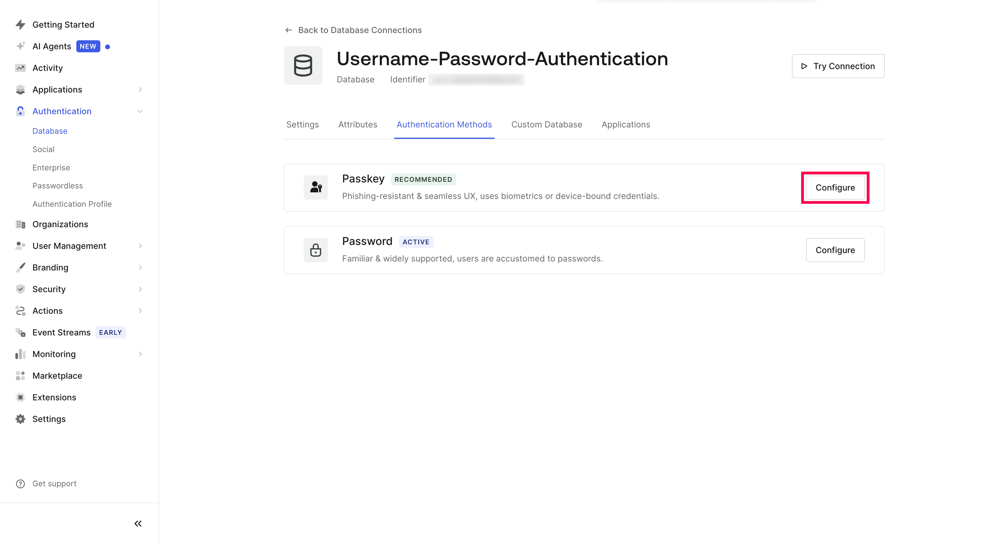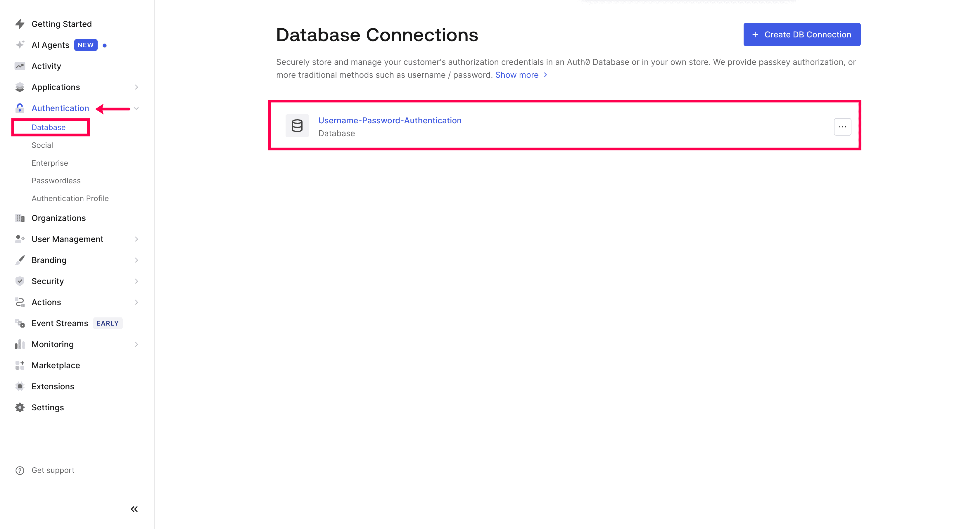 3. Authentication セクションの Database に移動し、Username-Password-Authentication データベースをクリックします。