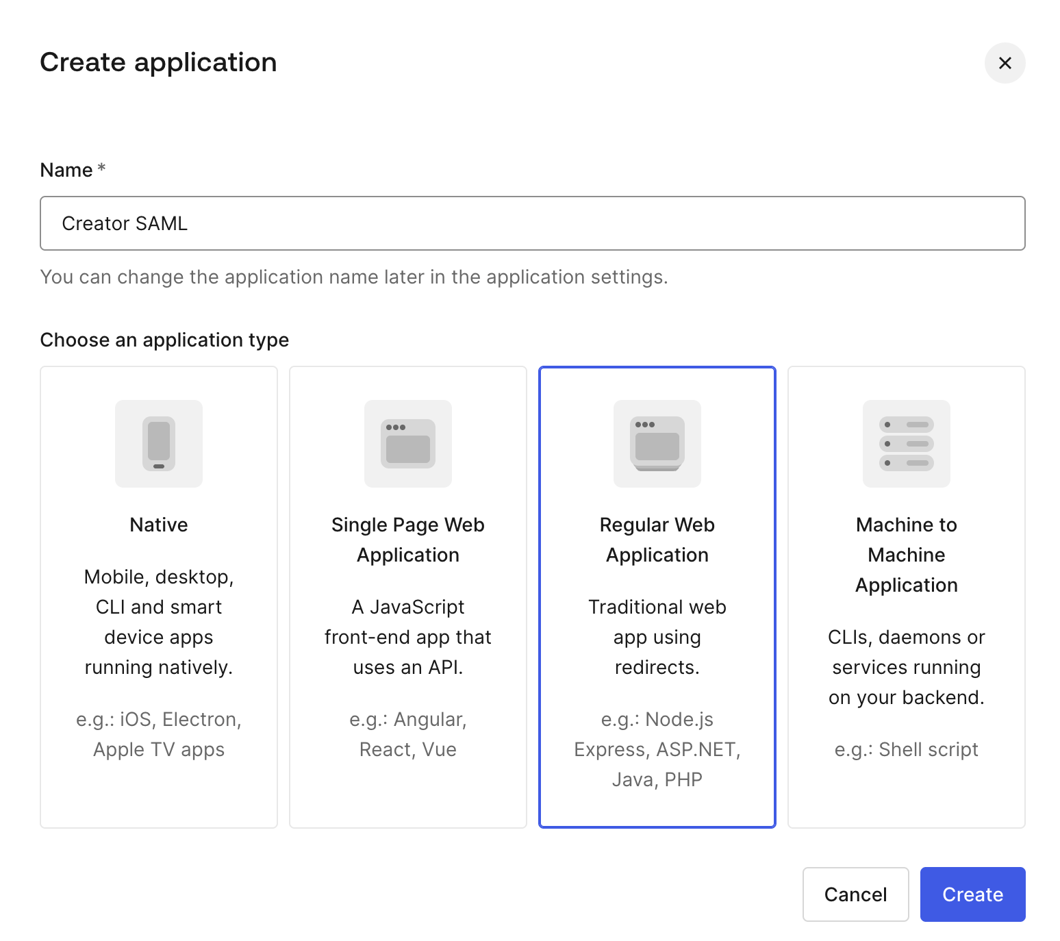 7. アプリケーション名を入力し、Application Type として Regular Web Application を選択して、Create をクリックします。作成したアプリケーションの詳細ビューが表示されます。