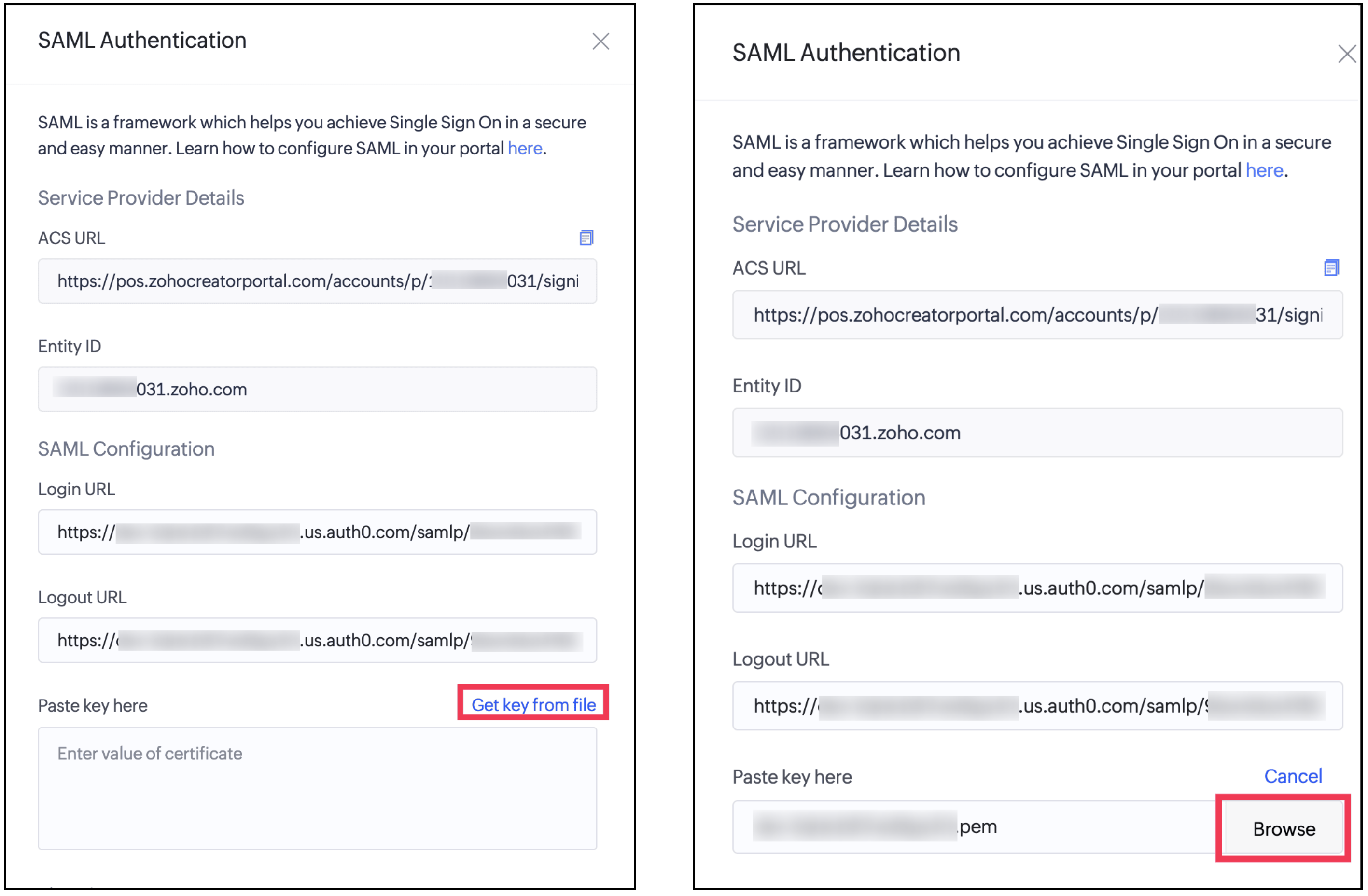 15. Get Key from file リンクをクリックし、Browse をクリックして、ダウンロードした証明書 (.pem) ファイルを選択します(手順 12 参照)。
