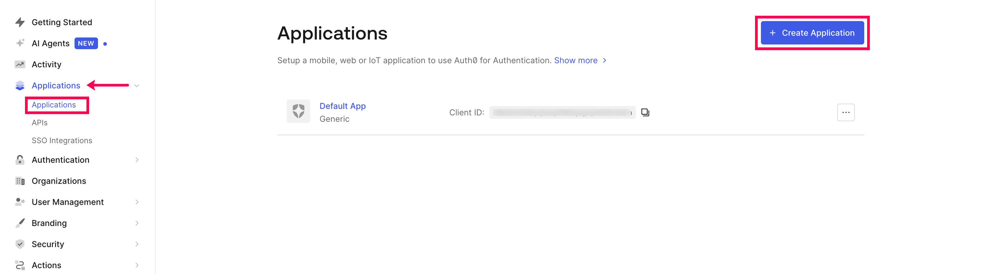 6. 左ペインの アプリケーション セクションで アプリケーション に移動し、+ Create Application をクリックします。