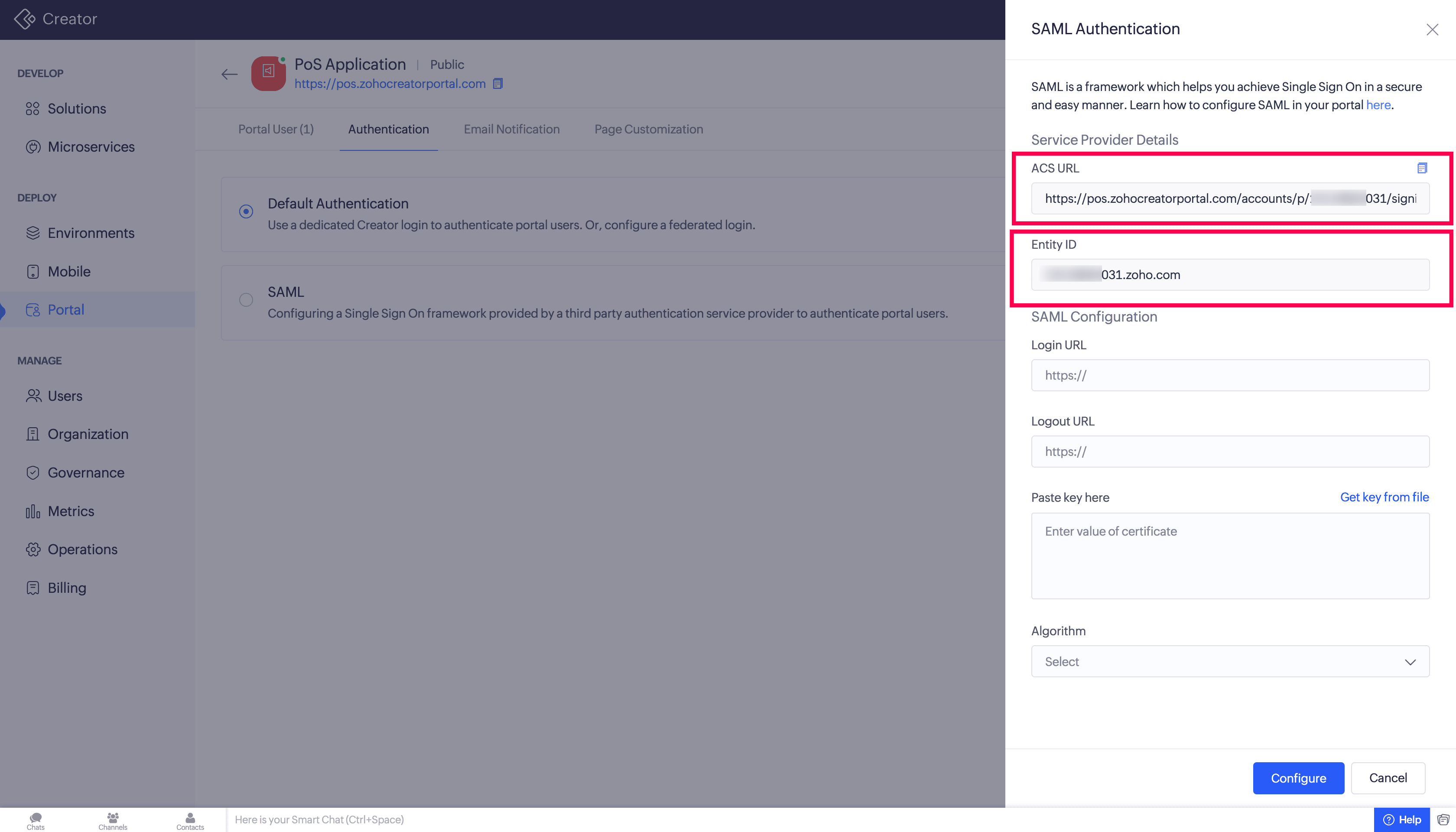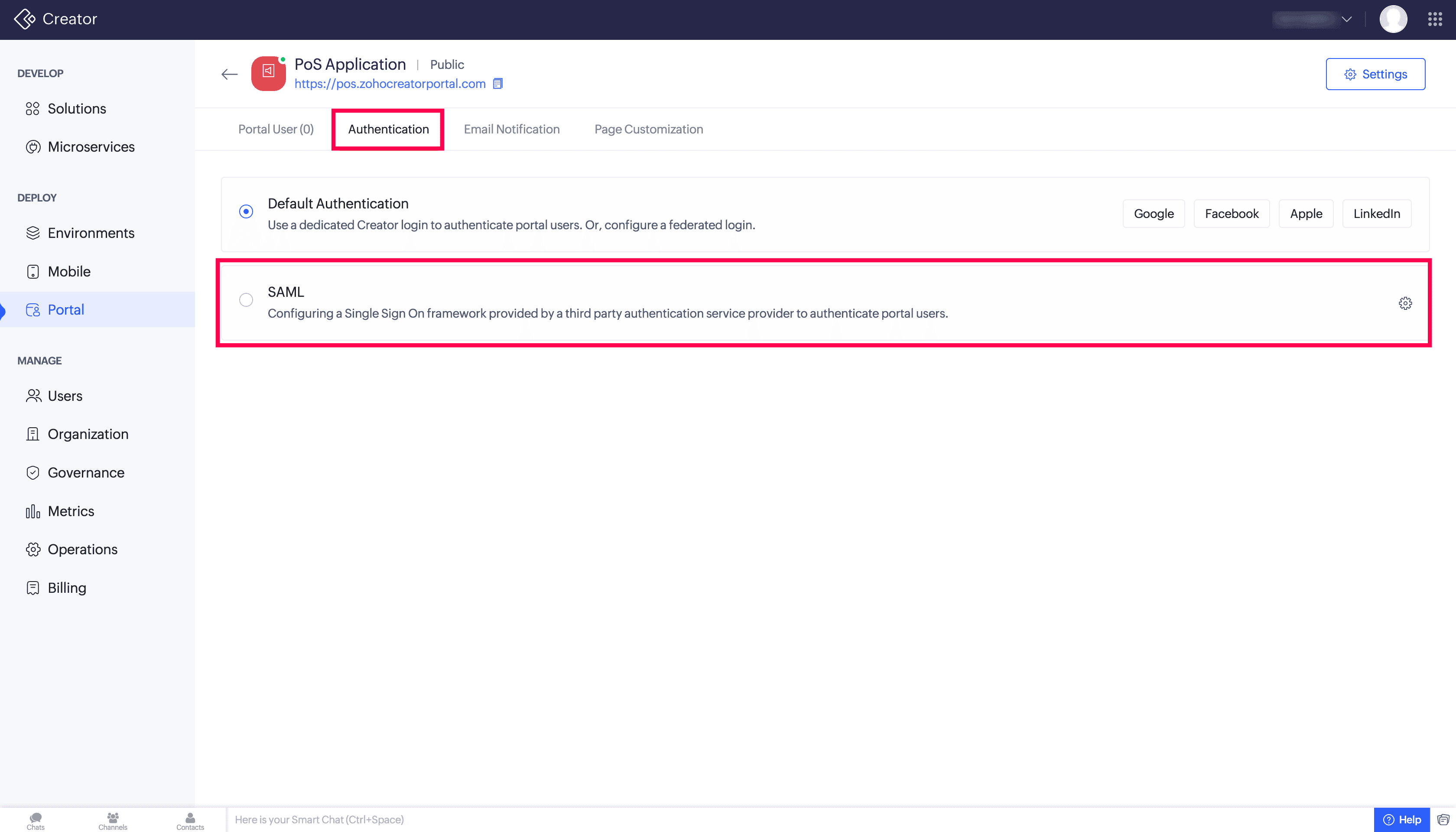 1. ポータルを設定し、Zoho Creator アカウント内の本番アプリケーションに対して SAML 認証を有効にします。ポータルの設定ガイドに従ってポータルを作成してください。