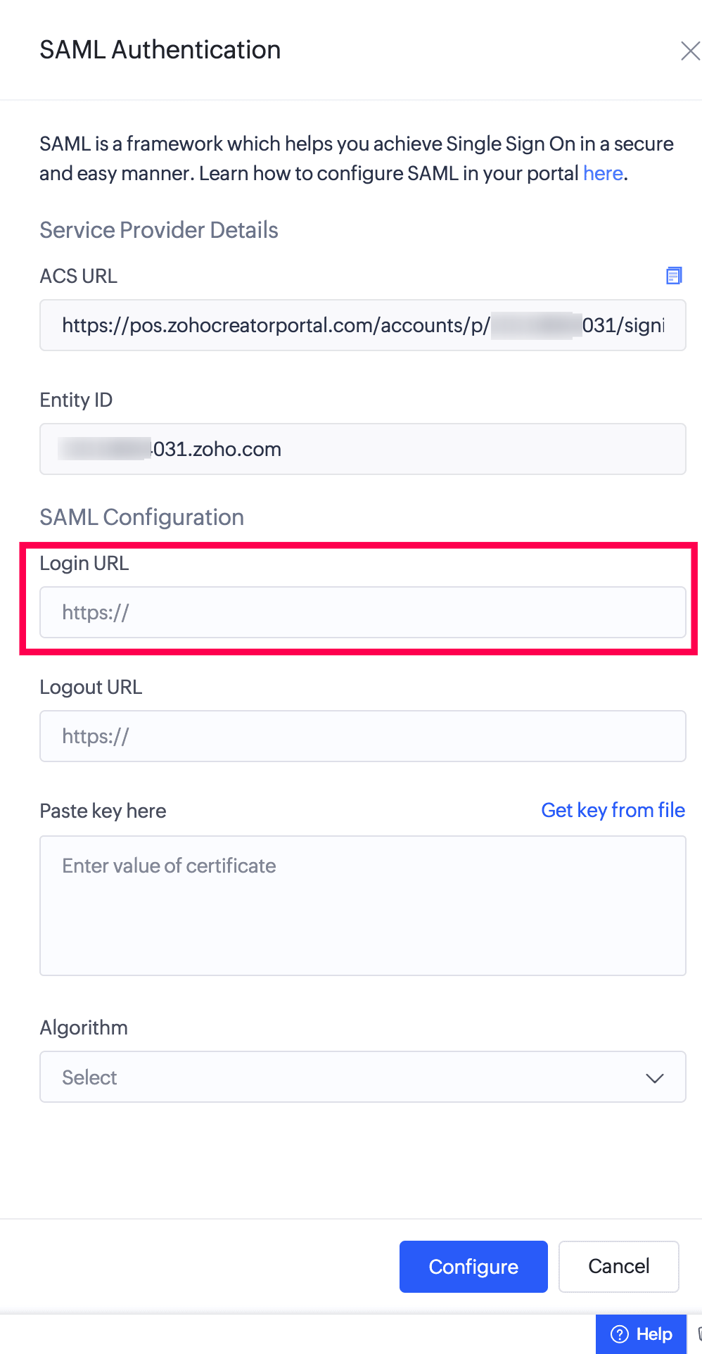 13. Zoho Creator を開いているブラウザータブに戻り、ポータルの SAML 認証の設定を続行します(手順 4 参照)。先ほどコピーした Identity Provider Login URLLogin URL フィールドに貼り付けます。