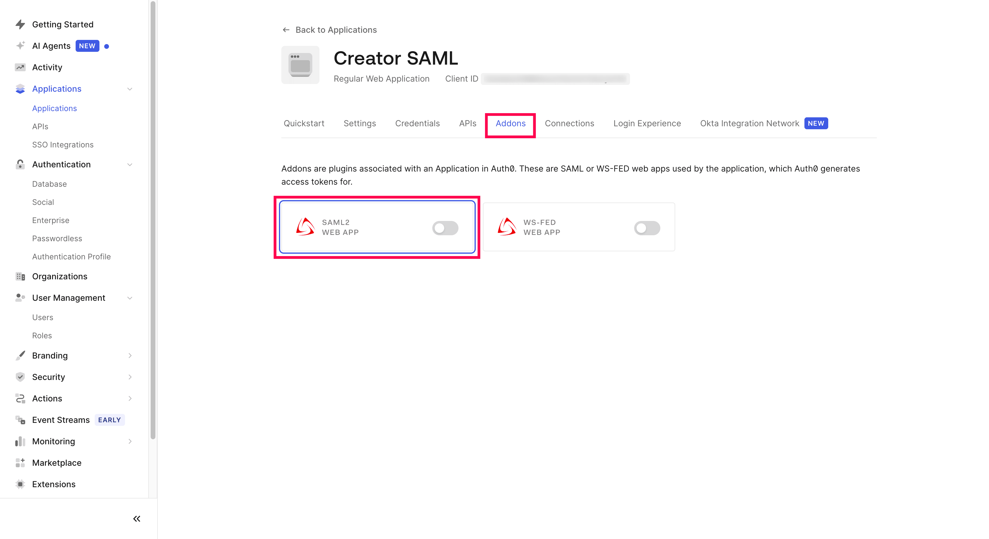 8. 上部メニューバーの Settings タブを選択し、SAML2 Web App トグルをクリックします。設定ポップアップが表示されます。