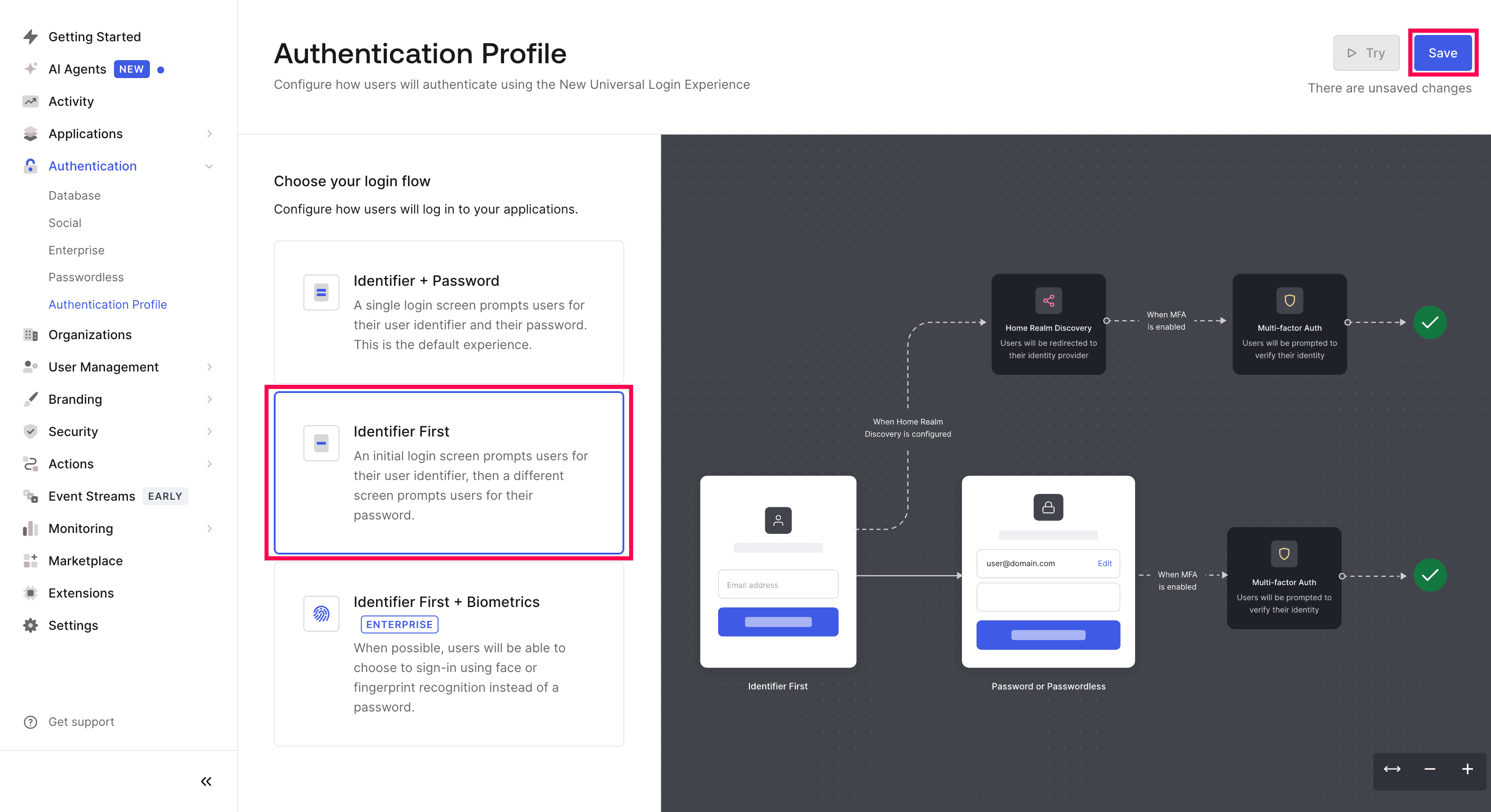 2. ダッシュボードの Authentication セクションで Authentication Profile に移動し、ログインフローとして Identifier First を選択します。保存 をクリックします。
