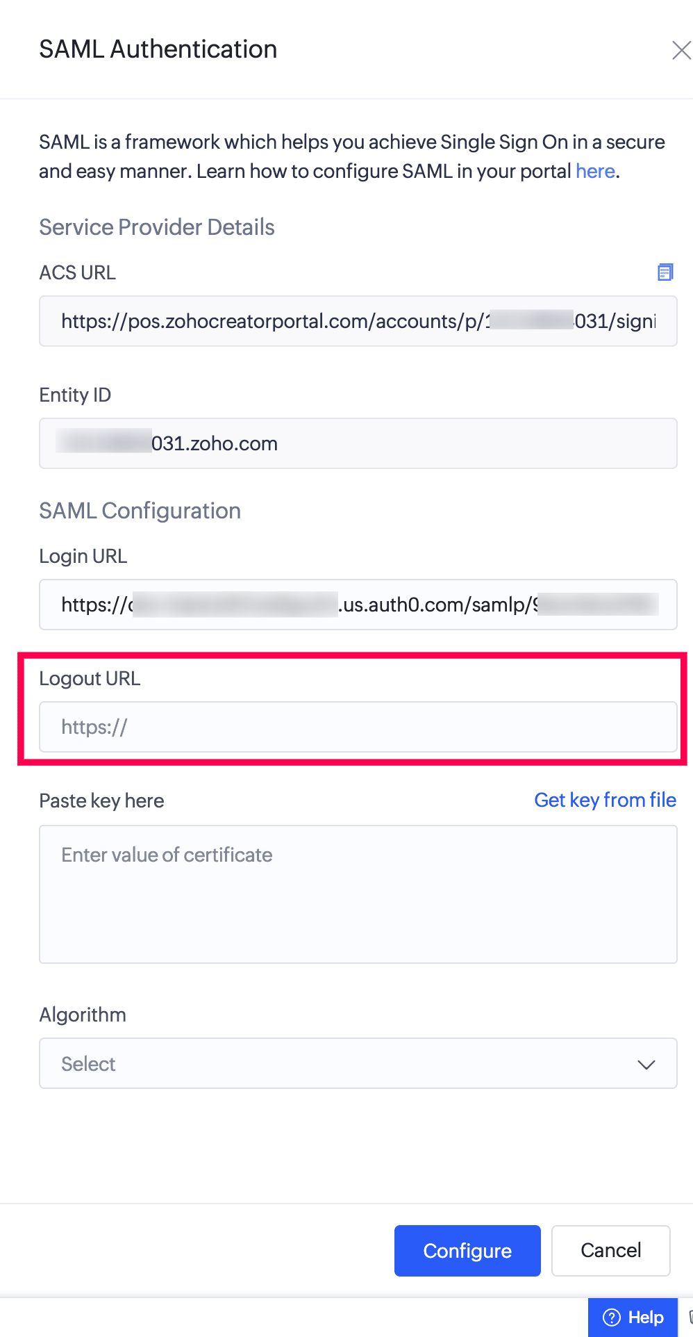 2. 例: {ポータル Logout URL}: https://pos.zohocreatorportal.com/accounts/p/40-11118664031/logout/samlsp/11118664031