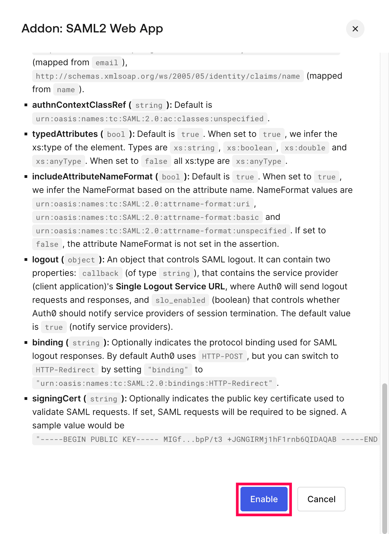 11. 画面を下にスクロールし、Enable をクリックして SAML 認証を有効化します。