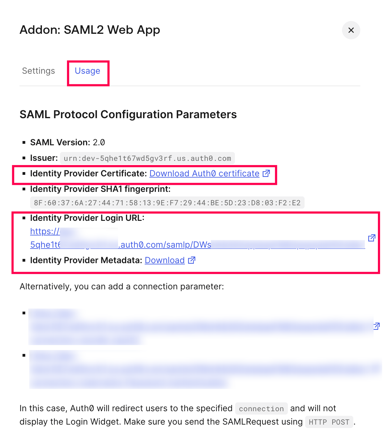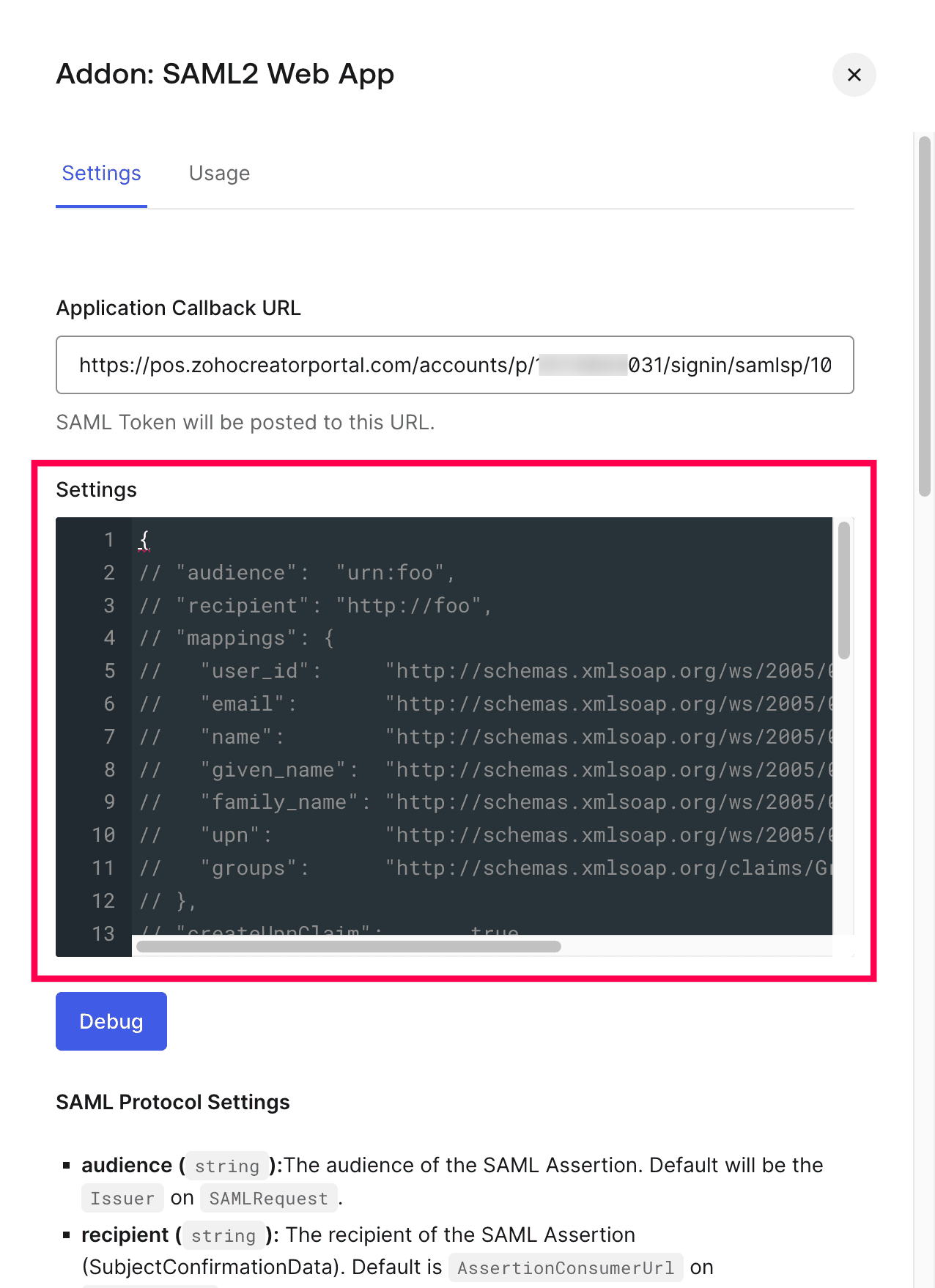 12. SAML ポップアップで Usage タブに切り替え、次の操作を行います。