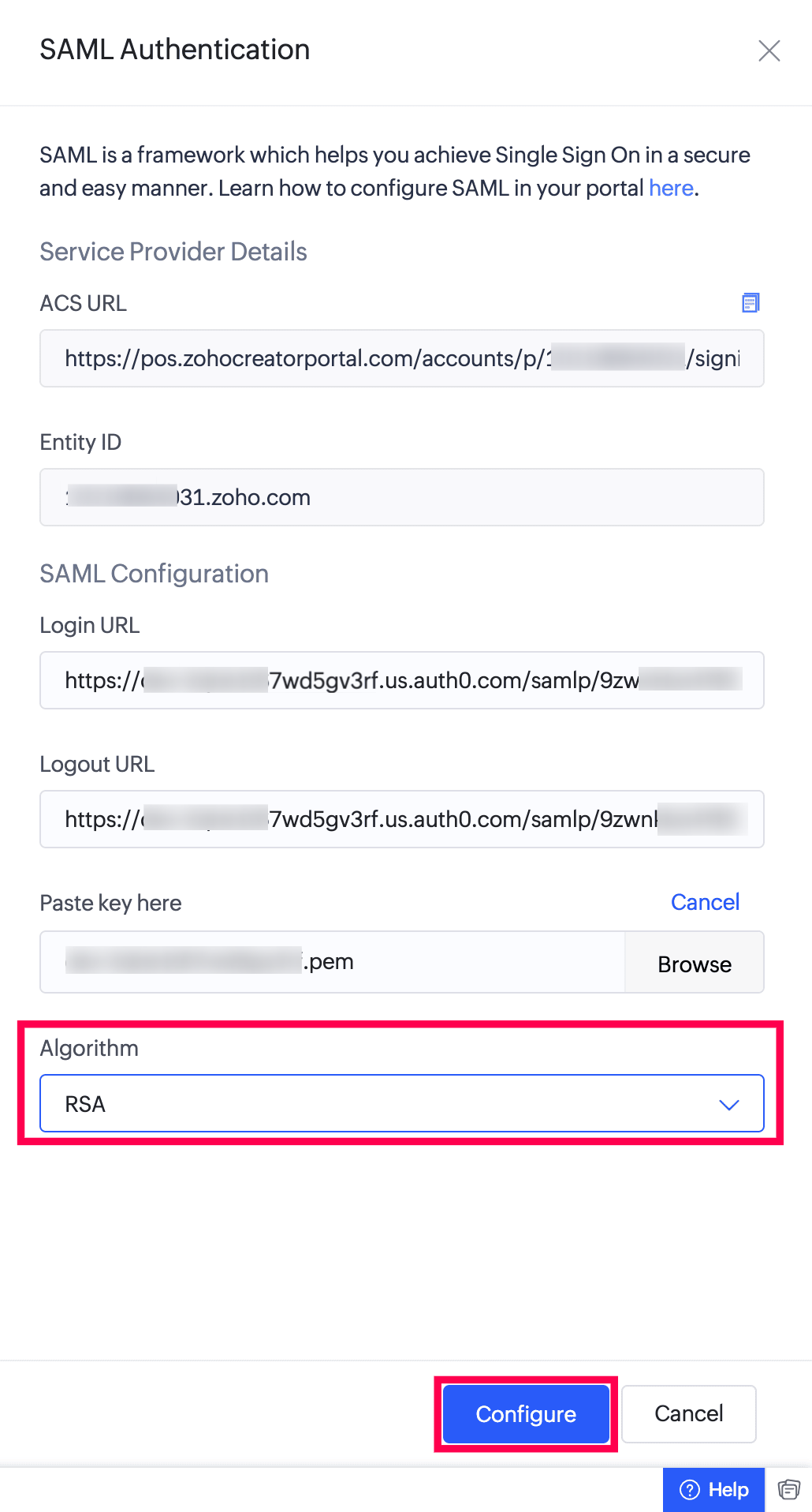 16. アルゴリズムとして RSA を選択します。これは Auth0 で使用されるデフォルトのアルゴリズムであり、その後 Configure をクリックします。
