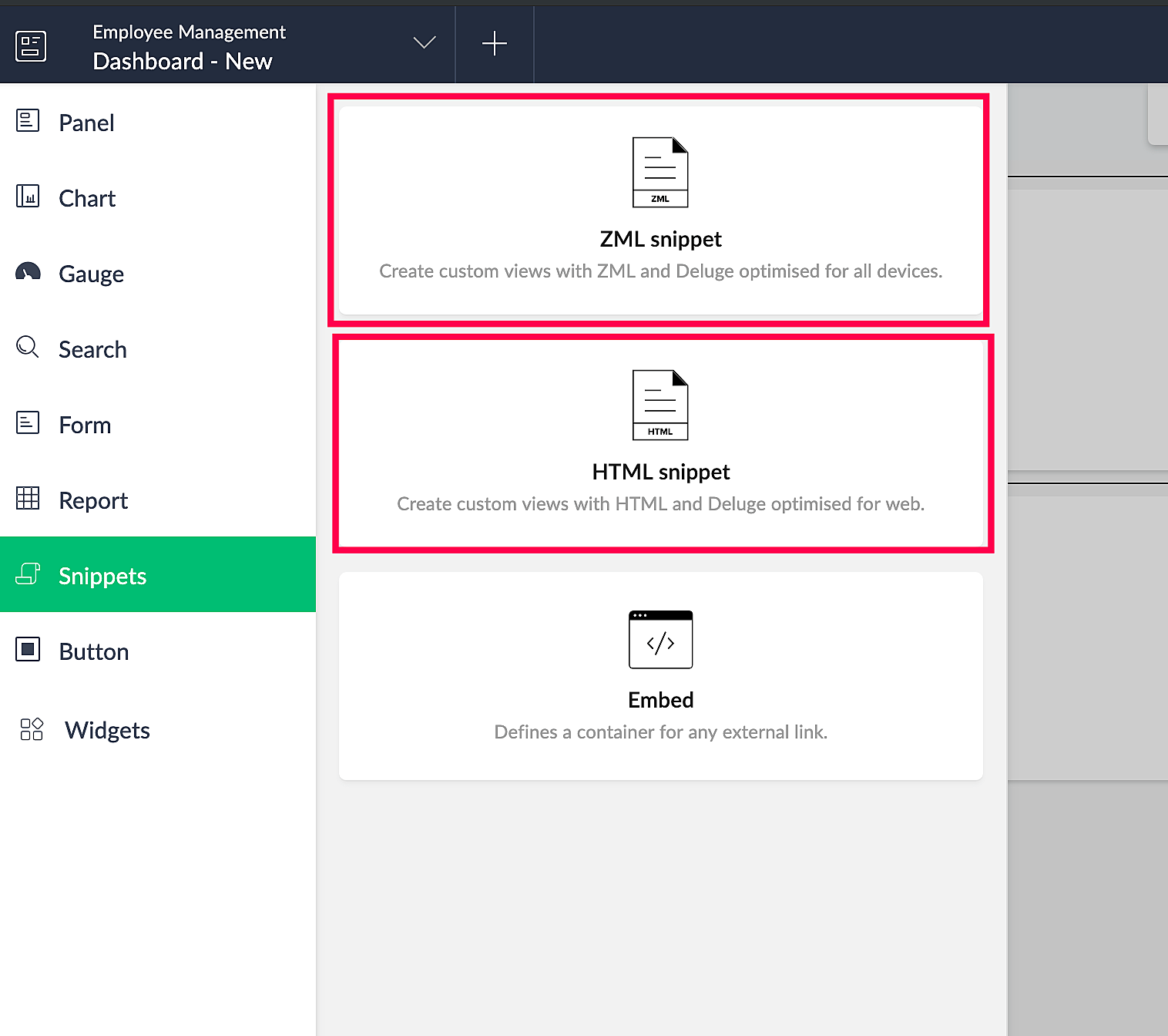 8. ページを作成 し、 ダッシュボード という名前を付けます。次に、 ZMLスニペット と HTMLスニペット をドラッグして追加します。