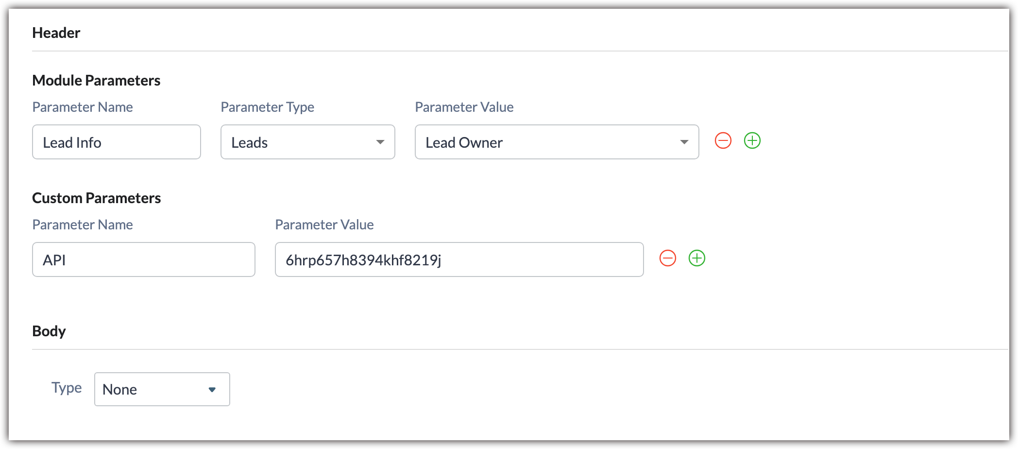 ヘッダーは主に、外部アプリケーション側で必要とされる場合に使用します。一般的には、APIキーや認証トークンなどの認証情報をヘッダーに含めるように指定されていることがよくあります。ヘッダーのパラメーターには、Zoho CRMのタブの項目の値を差し込むことが可能です( タブのパラメーター )。または、任意の値を手動で指定することも可能です( 独自パラメーター )。設定では、必要なパラメーター名と値を入力します。