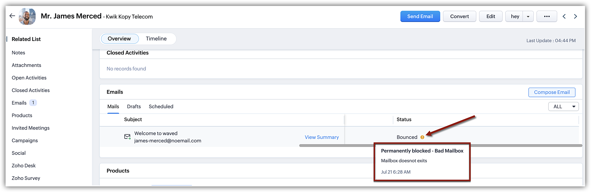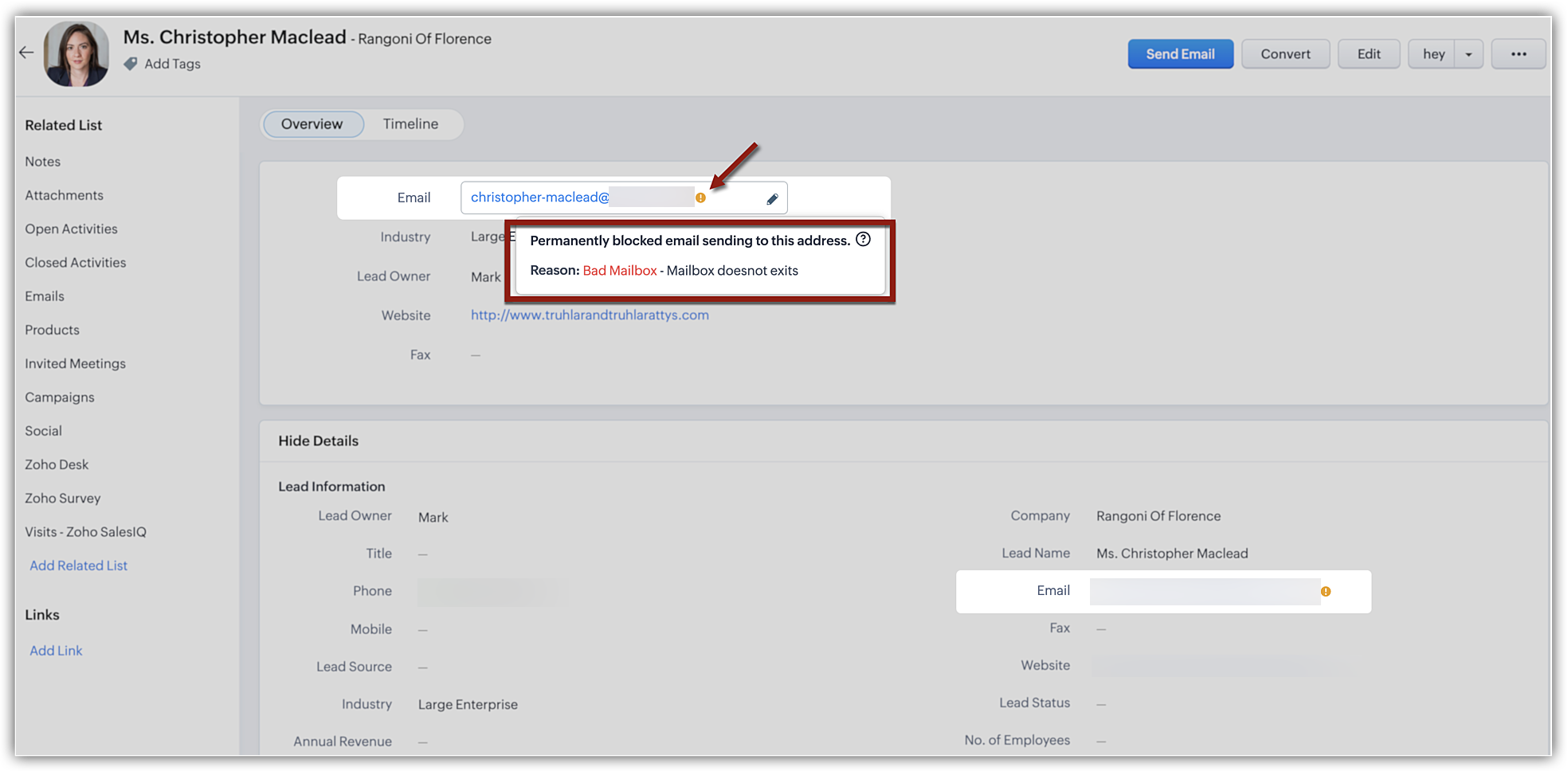 また、Zoho CRMでメールアドレスの不達設定を解除する前に、受信者側の問題を解消しておくことをお勧めします。問題が解消されないまま、メールを送信し続けると、送信元のメールアドレスの到達率が低下する可能性があります。