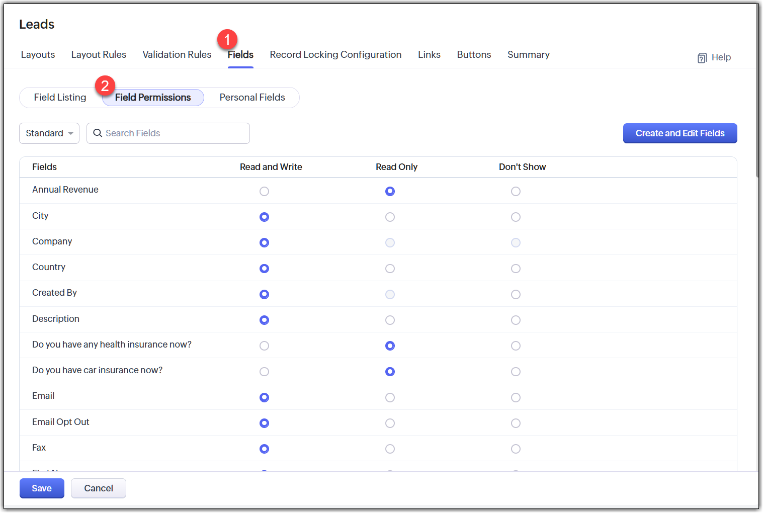 Zoho CRMのタブのカスタマイズ画面にある[項目]欄には、該当のタブ内の項目の一覧とその詳細が表示されます。[項目]欄は、[項目の一覧]、[項目の権限]、[個人情報の項目]の3つに分かれています。[項目の一覧]では、該当のタブ内の項目の一覧とその詳細を確認できます。[項目の権限]では、ユーザー権限ごとの各項目に対するアクセス権限を設定できます。[個人情報の項目]では、個人情報として設定した項目の一覧を確認できます。