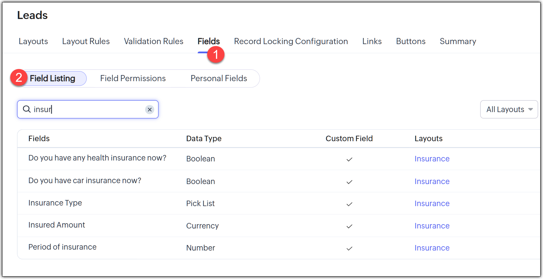 Zoho CRMの利用を進めるにつれて項目の数が多くなってくると、項目の管理が煩雑に感じることもあるでしょう。そのような場合は、[項目の一覧]ページを表示することで、タブ内のすべての項目の一覧と、各項目のデータの種類、カスタム項目であるかどうか、使用されているレイアウトなど詳細をまとめて確認できます。