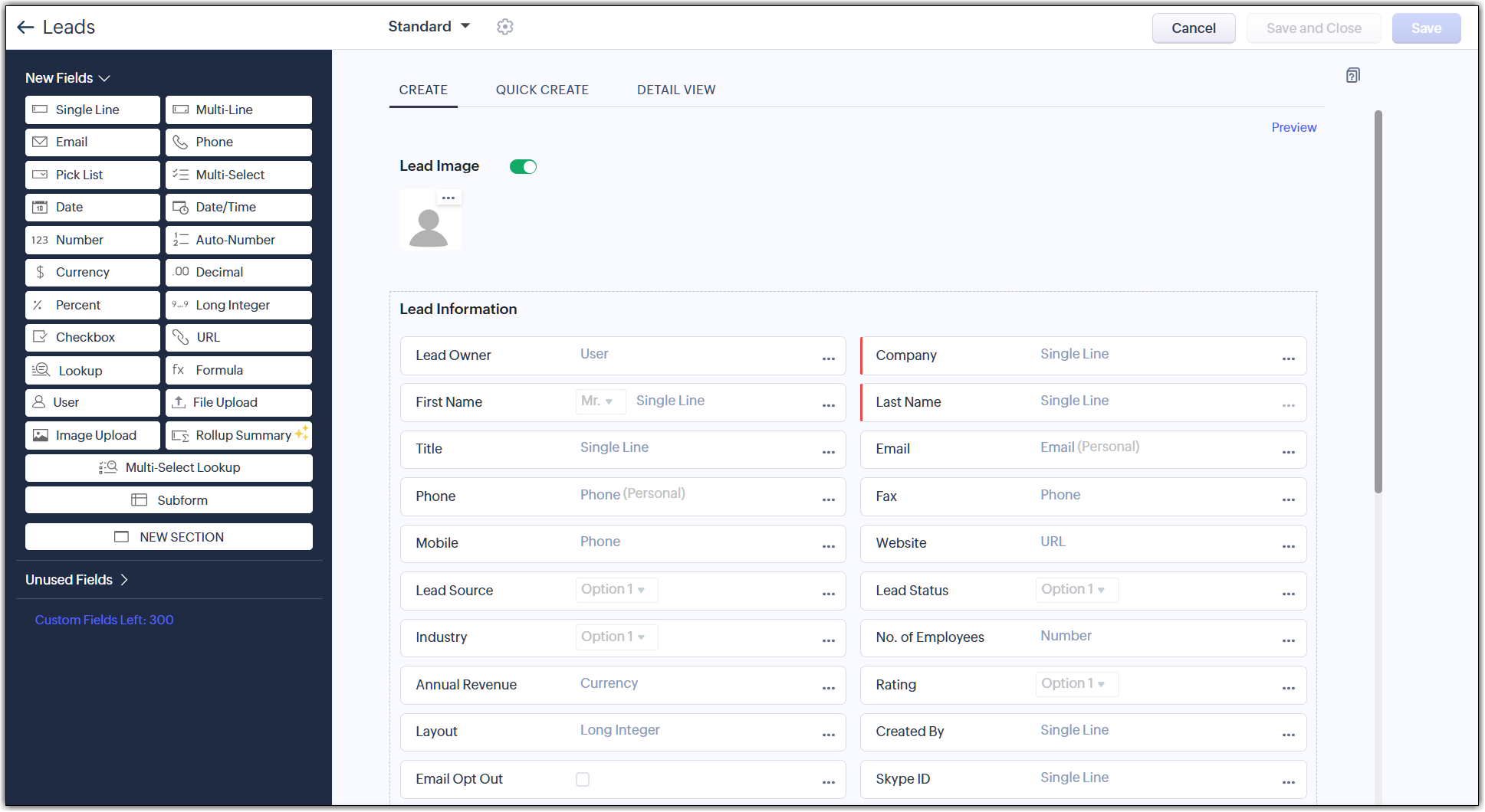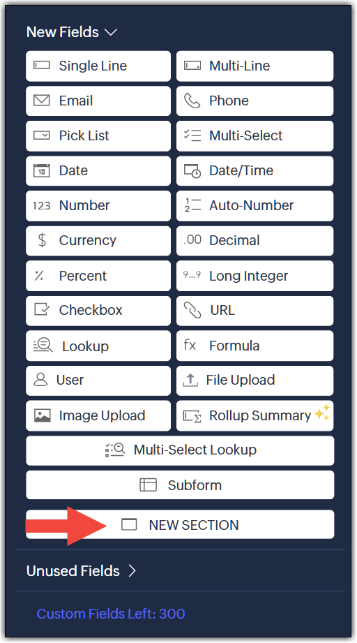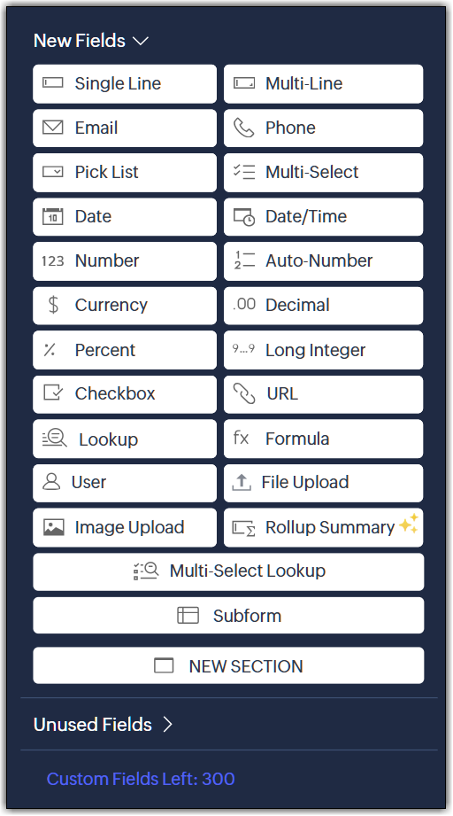 アカウントで作成可能な項目数の合計や、作成可能な項目の種類にも、上限があります。これは、利用中のZoho CRMのプランによって異なります。各プランの上限については、