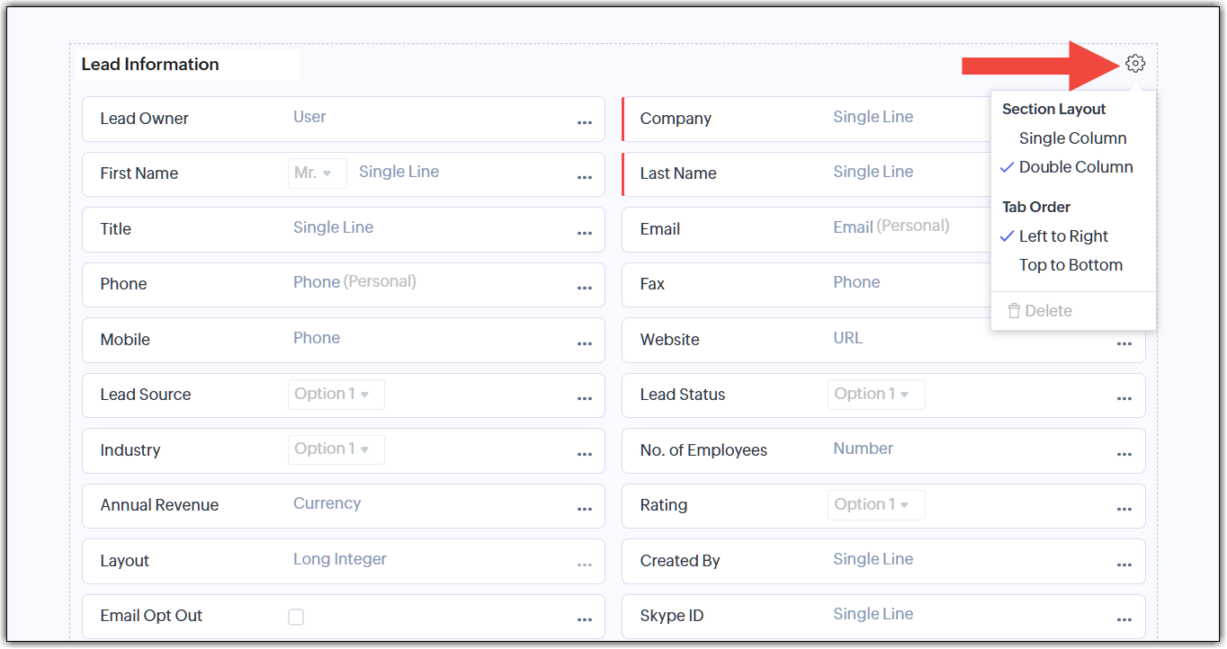 - セクションのレイアウトの表示設定を、1列または2列に切り替えます。セクションを移動して、並べ替えます。不要なセクションを削除する場合、右上にある歯車アイコンをクリックし、メニューから[削除する]を選択します。