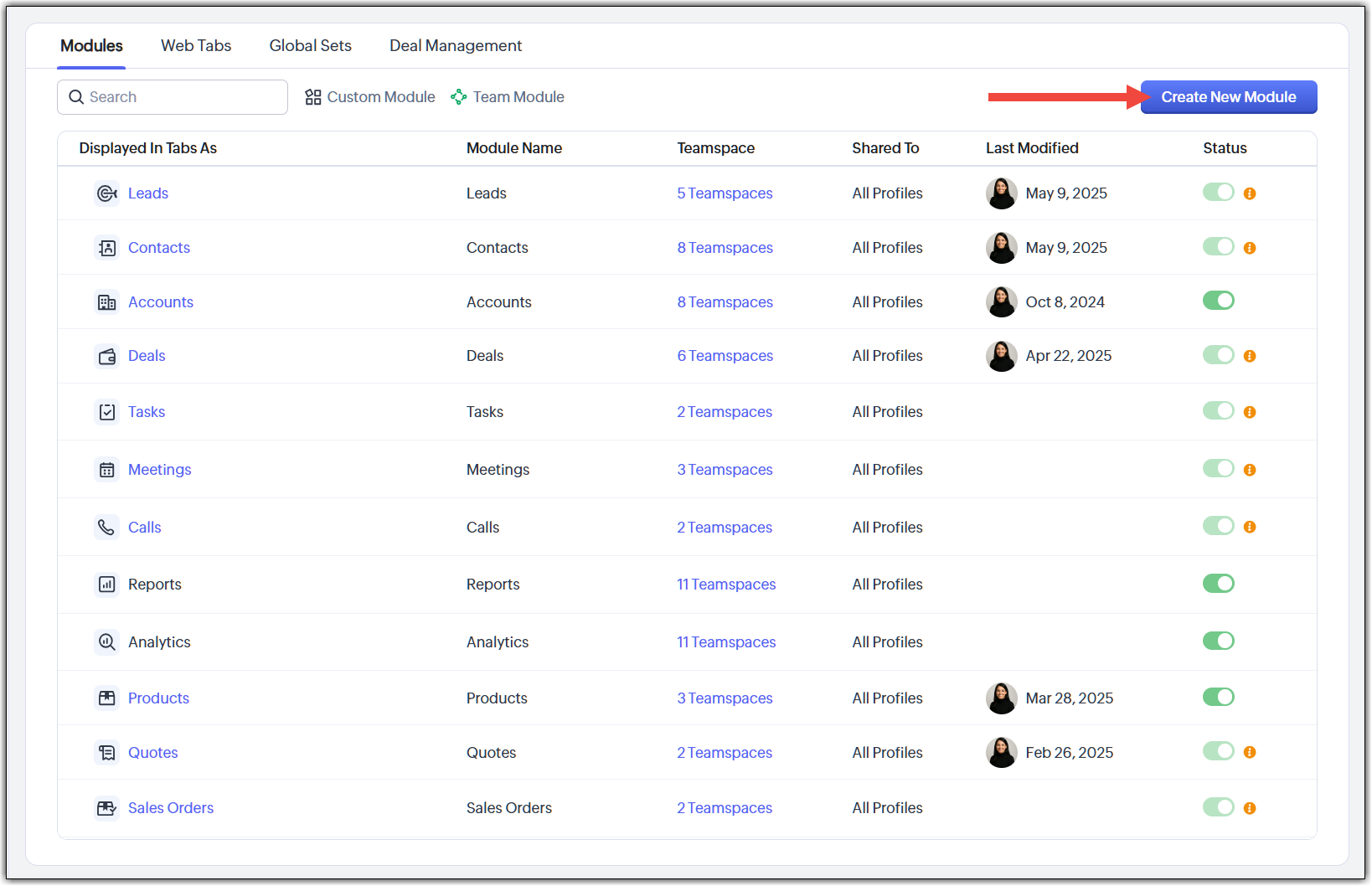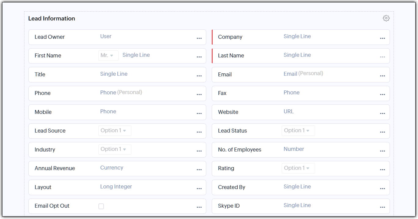 Zoho CRMの標準タブが、常にすべての要件を満たすとは限りません。そのような場合、Zoho CRMでは、要件に合わせて、新しいタブを作成できます。たとえば、教育機関でZoho CRMを利用する場合、[見込み客]、[連絡先]、[商談]などのタブは最適とは言えないでしょう。この場合、[学生]、[教員]、[履修科目]など、より適切なタブを作成できます。また、医療機関でZoho CRMを利用する場合は、[患者]、[医師]、[看護師]、[診療録]といった新しいタブを作成できます。