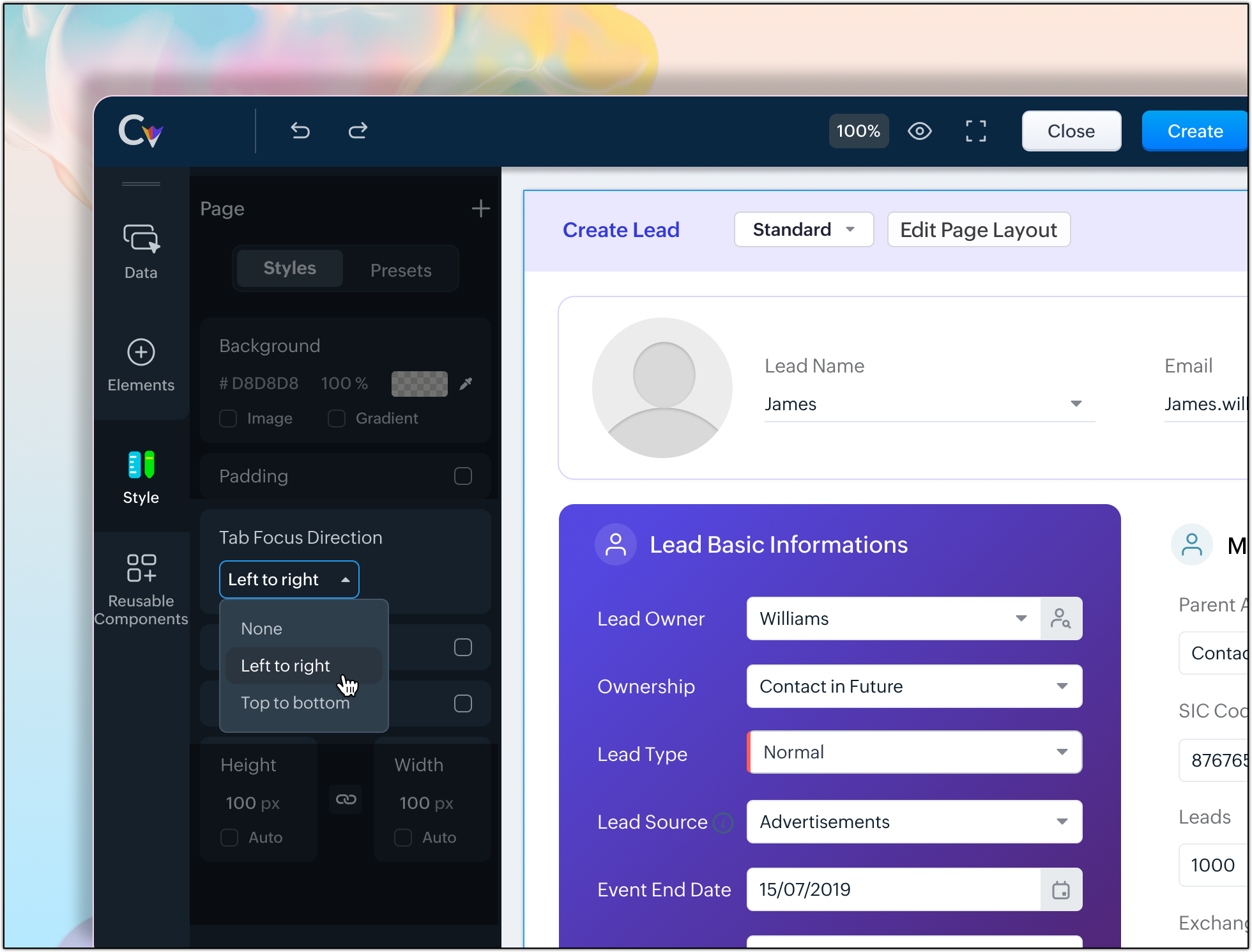 キャンバスの設計画面で、テキスト項目、画像、ボタン、チェックボックスなどの要素をドラッグ&ドロップします。要件に合わせて、要素の配置やデザインを指定できます。