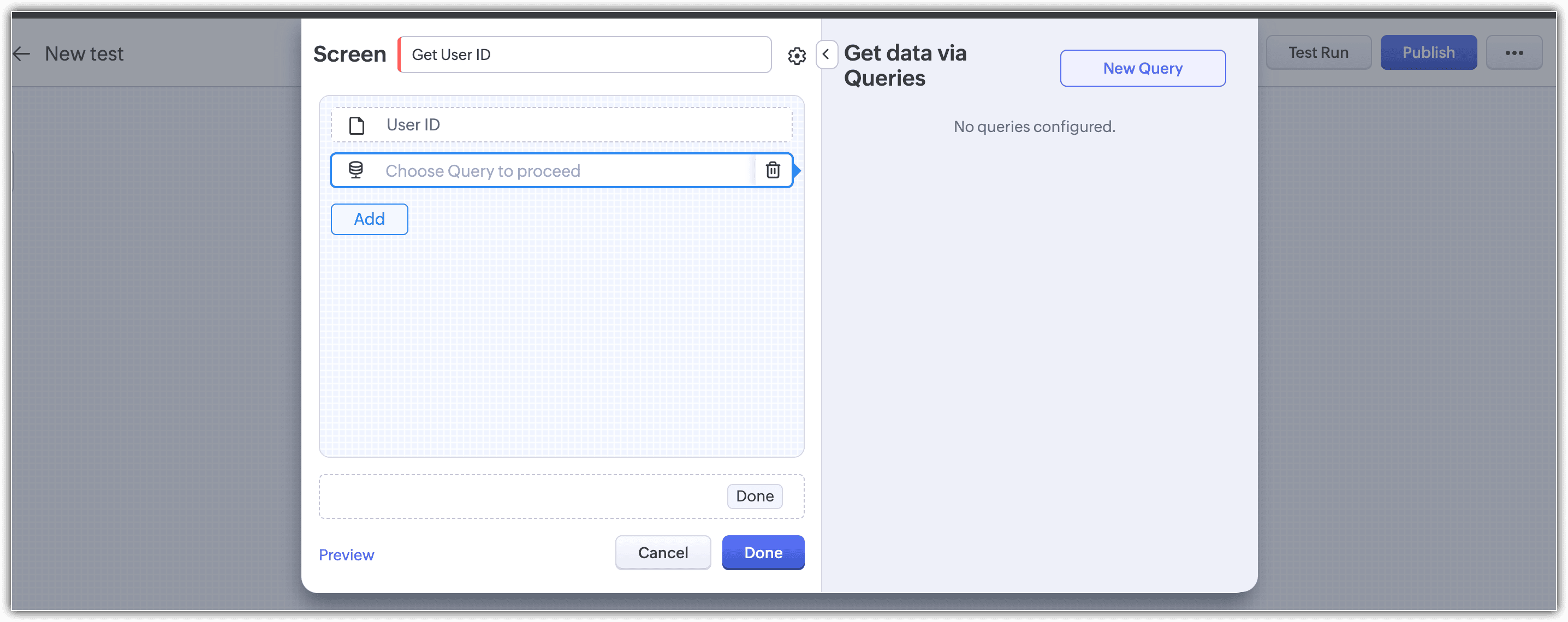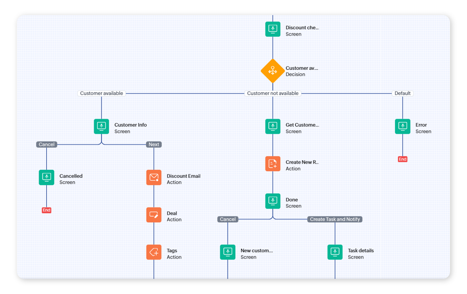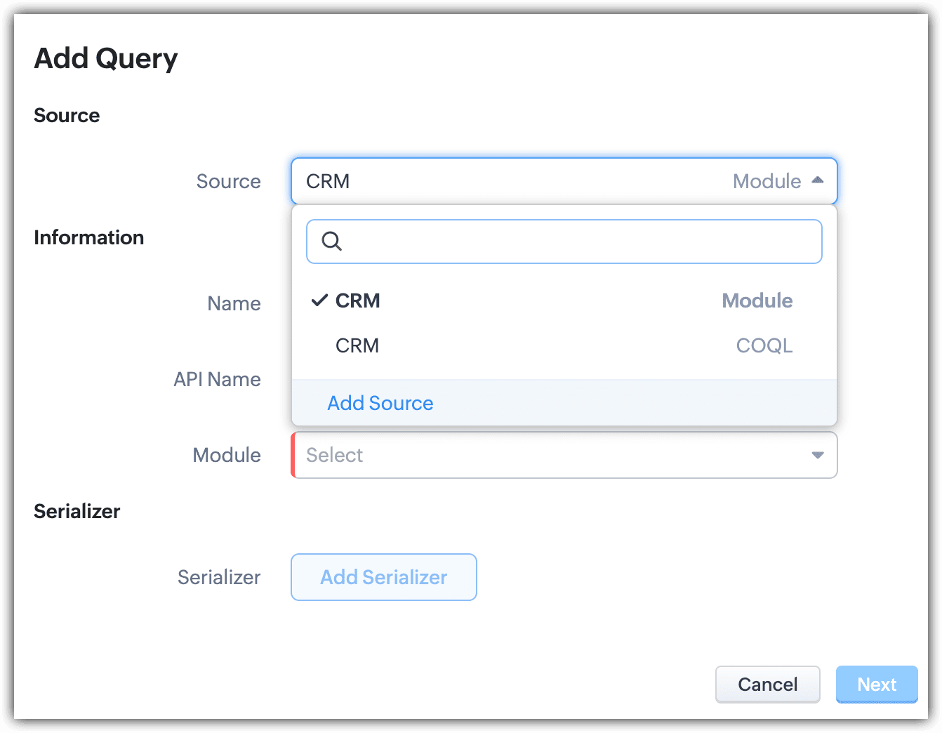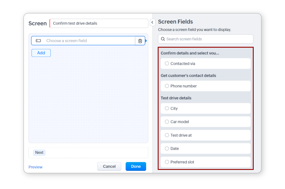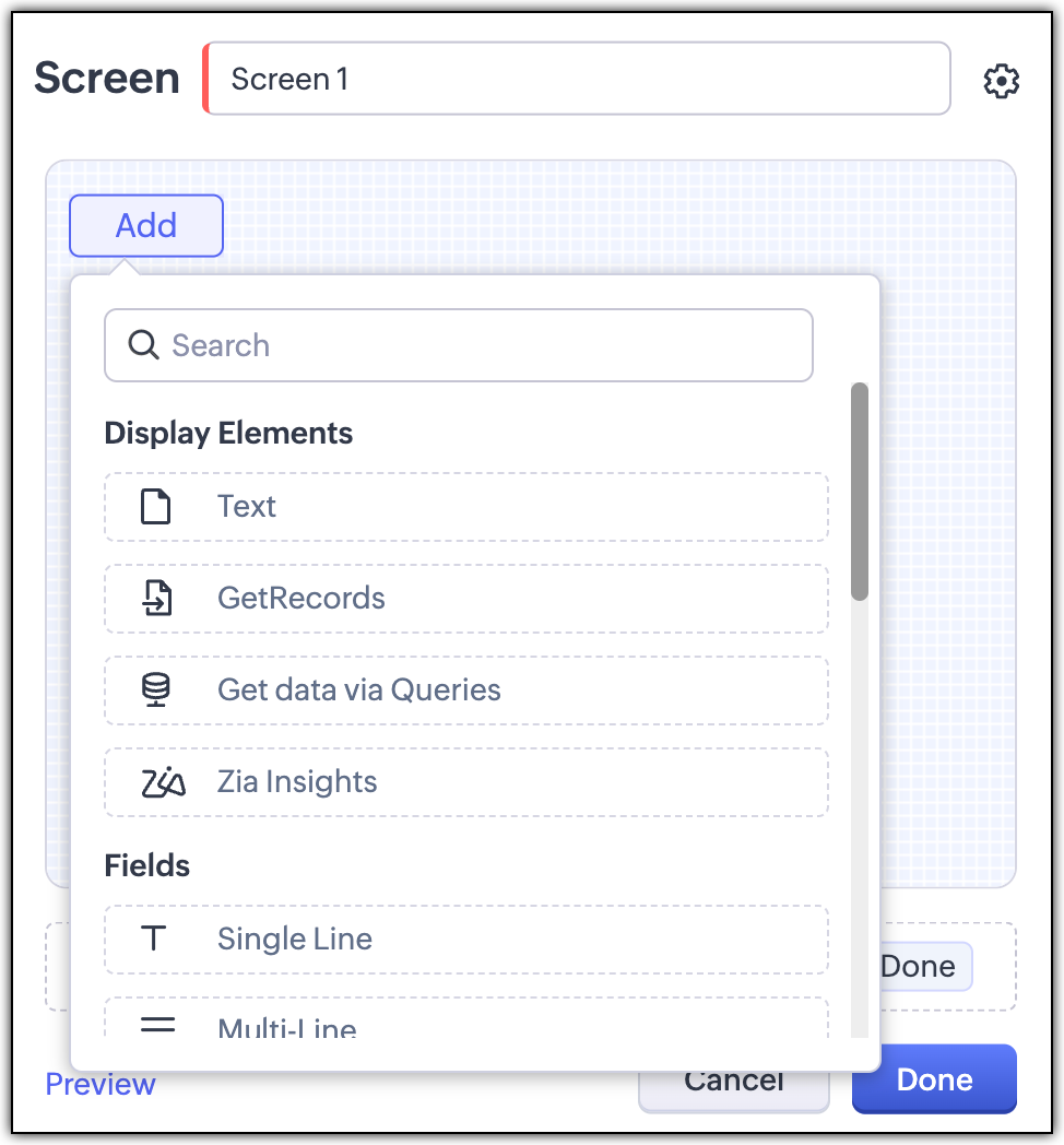 クエリー:キオスクでクエリーを使用すると、必要なデータに自動でアクセスしてデータを取得できます。データを取得するにあたっては、Zoho CRMのAPIまたはCOQL(CRM Object Query Language:CRM内のデータを取得するための構文)を使用します。また、必要に応じて外部サービスのデータを取得することも可能です。クエリーは、画面と分岐の要素で使用できます。