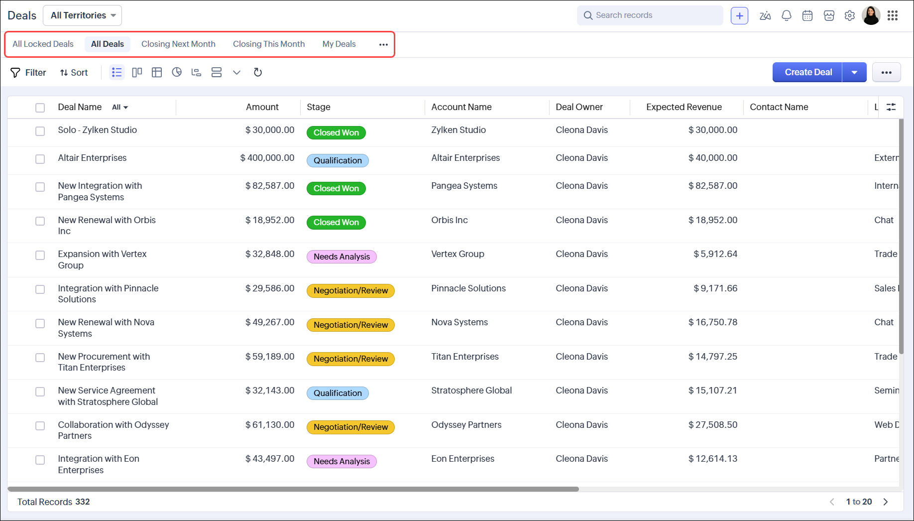 Zoho CRMには、組織内のすべてのユーザーがすぐに使用できる、 標準 ビューが用意されています。また、独自のビュー(カスタムビュー)を作成することも可能です。作成したビューは、他のユーザーに共有することもできます。