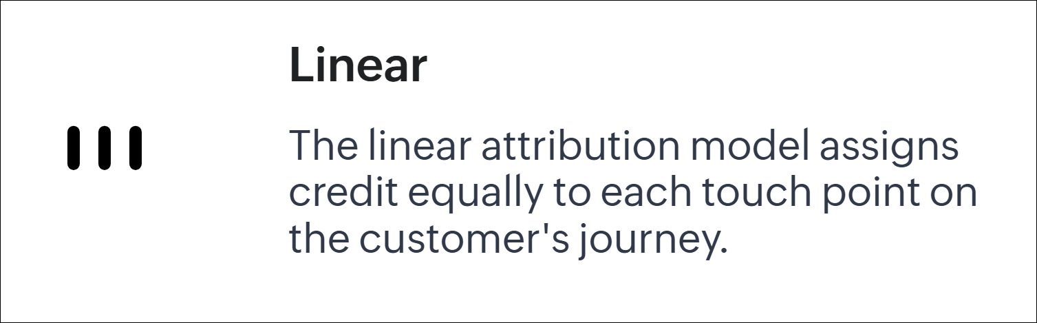線形アトリビューションモデルでは、各タッチポイントに対して貢献度が均等に分配されます。起点、終点、中間地点は、すべて同程度の重要度で扱われます。たとえば、カスタマージャーニーに10件のタッチポイントがある場合、各タッチポイントに貢献度の10%ずつが割り当てられます。線形モデルは、売上向上において、中間タッチポイントが起点や終点と同様に重要であるという考え方にもとづいています。ただし、各タッチポイントを均等に重要視するため、理想主義的すぎる可能性があります。実際には、各タッチポイントが全く同額ずつ売上に貢献するということはあり得ません。この点を踏まえ、各キャンペーンに対して貢献度の重み(1から4の段階)を選択できます。さらに、売上にそれほど影響しないと考えられるキャンペーンは除外することもできます。