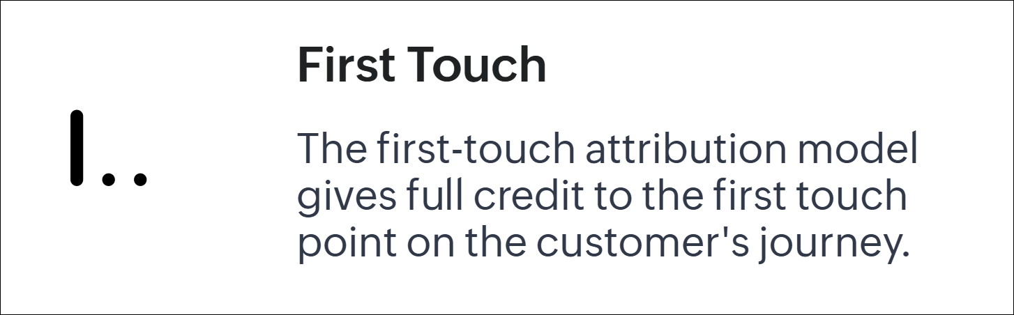 起点モデルでは、単一のタッチポイントに基づいて貢献度が割り当てられます。つまり、Webサイトに訪問者を初めて導いたマーケティング活動に貢献度の100%または商談金額が割り当てられます。起点モデルでは、基本的にファネルの最上部にあるマーケティングキャンペーンに重点を置きます。見込み客の獲得とブランド認知のみに注力する場合は、起点モデルが最適です。
