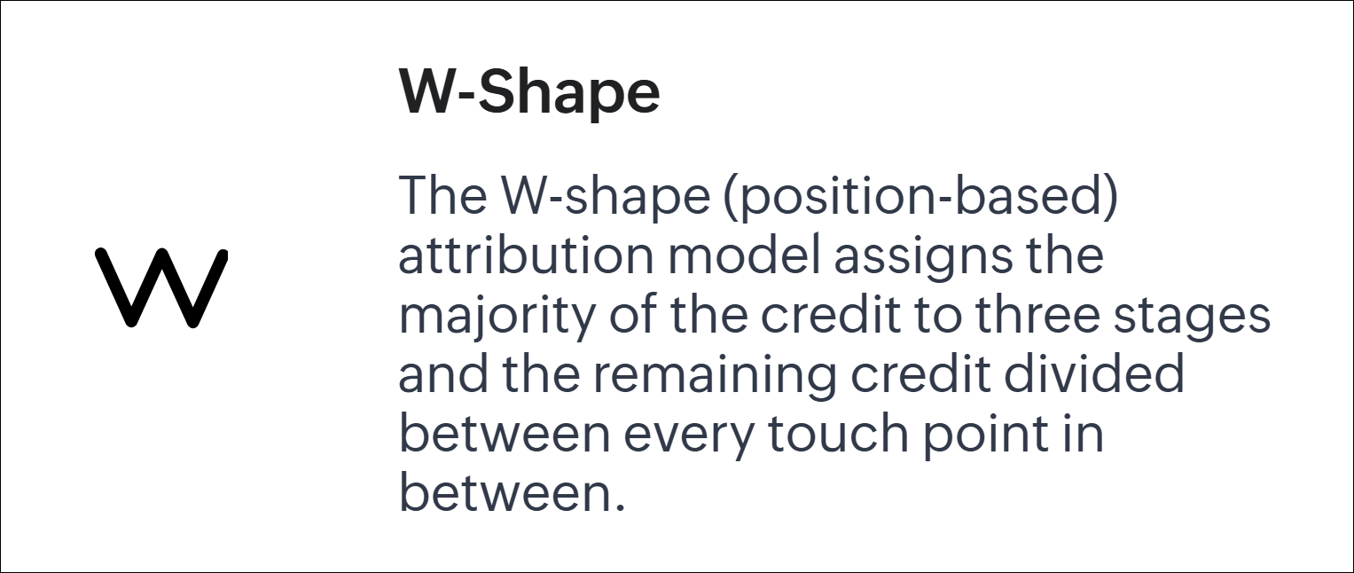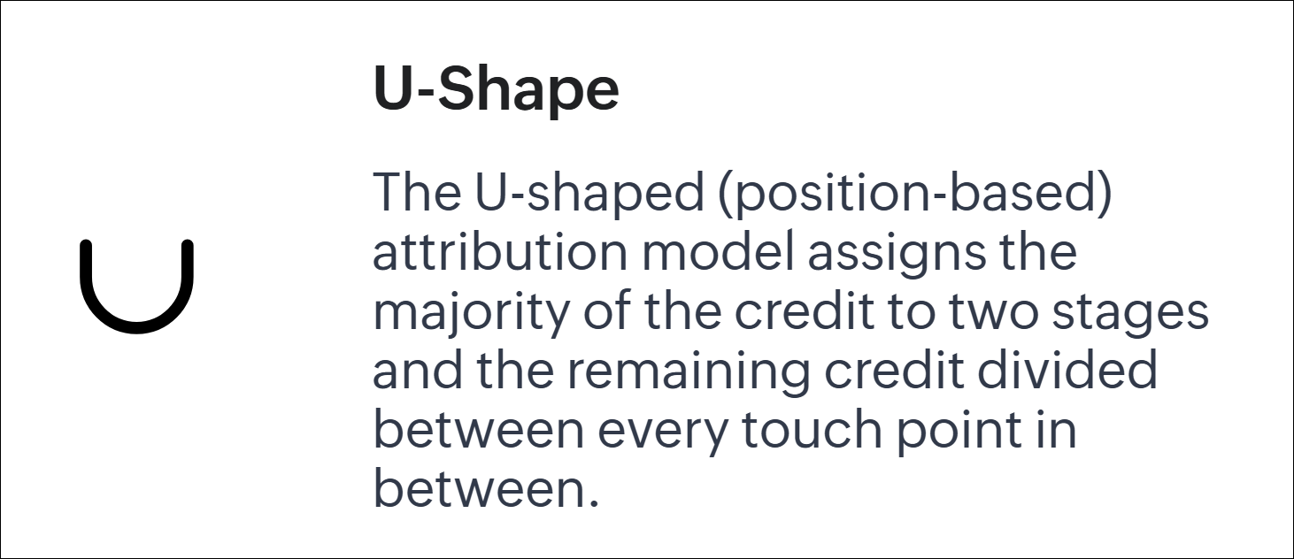 U型アトリビューションモデルでは、2つの主要なタッチポイント(起点と終点)と、その2点の間にある中間タッチポイントに、貢献度が割り当てられます。マーケティング活動による見込み客の獲得や初期のやりとりなどの起点には、貢献度の40%が割り当てられます。同様に、終点または商談受注には、貢献度の40%が割り当てられます。残りの20%は、2つのステージ遷移間で発生する中間タッチポイントに均等に分配されます。初期の見込み客とのやりとりが組織において極めて重要であり、同時に、商談の受注に直接関連する終点も重要である場合に、U型モデルが役立ちます。