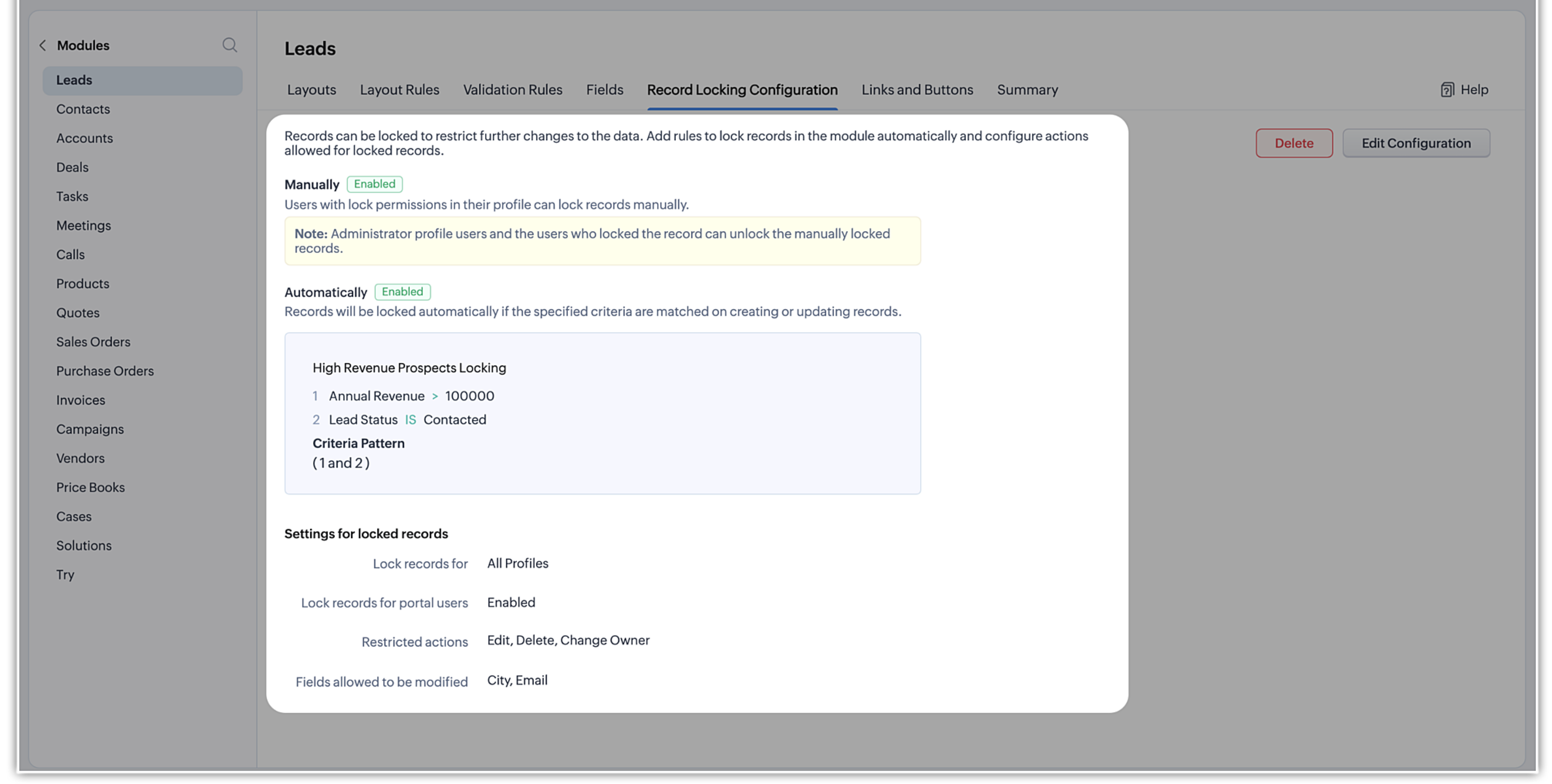 - Zoho CRMのプランを、ロック機能に対応していないプランにダウングレードした場合、データのロックはすべて自動で解除されます。その後、アップグレードしても、ダウングレード前のロックの状態を復元することはできません。