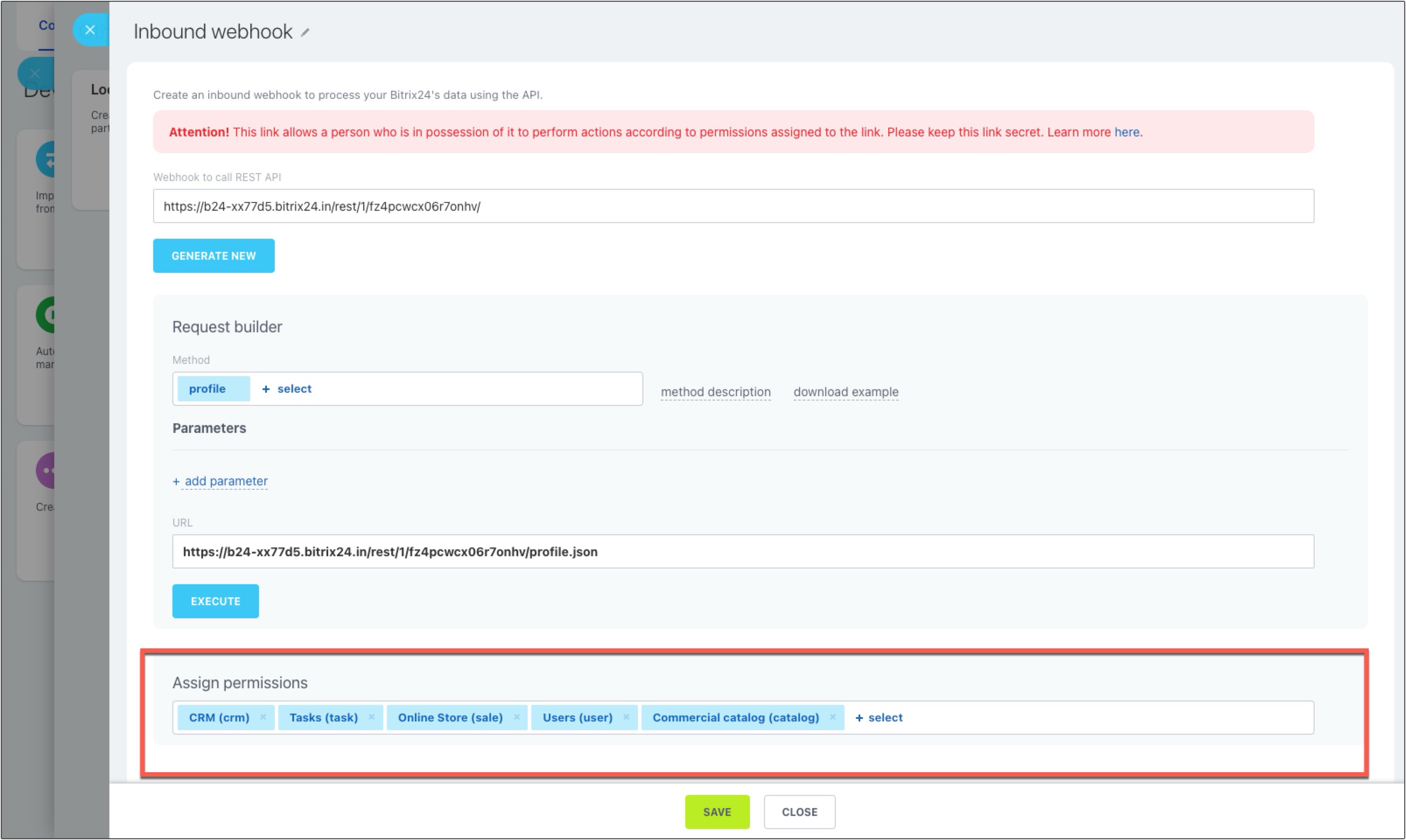 4. [インスタンスURL]の項目に、Bitrix24アカウントで取得したWebhook用のURLを入力します。