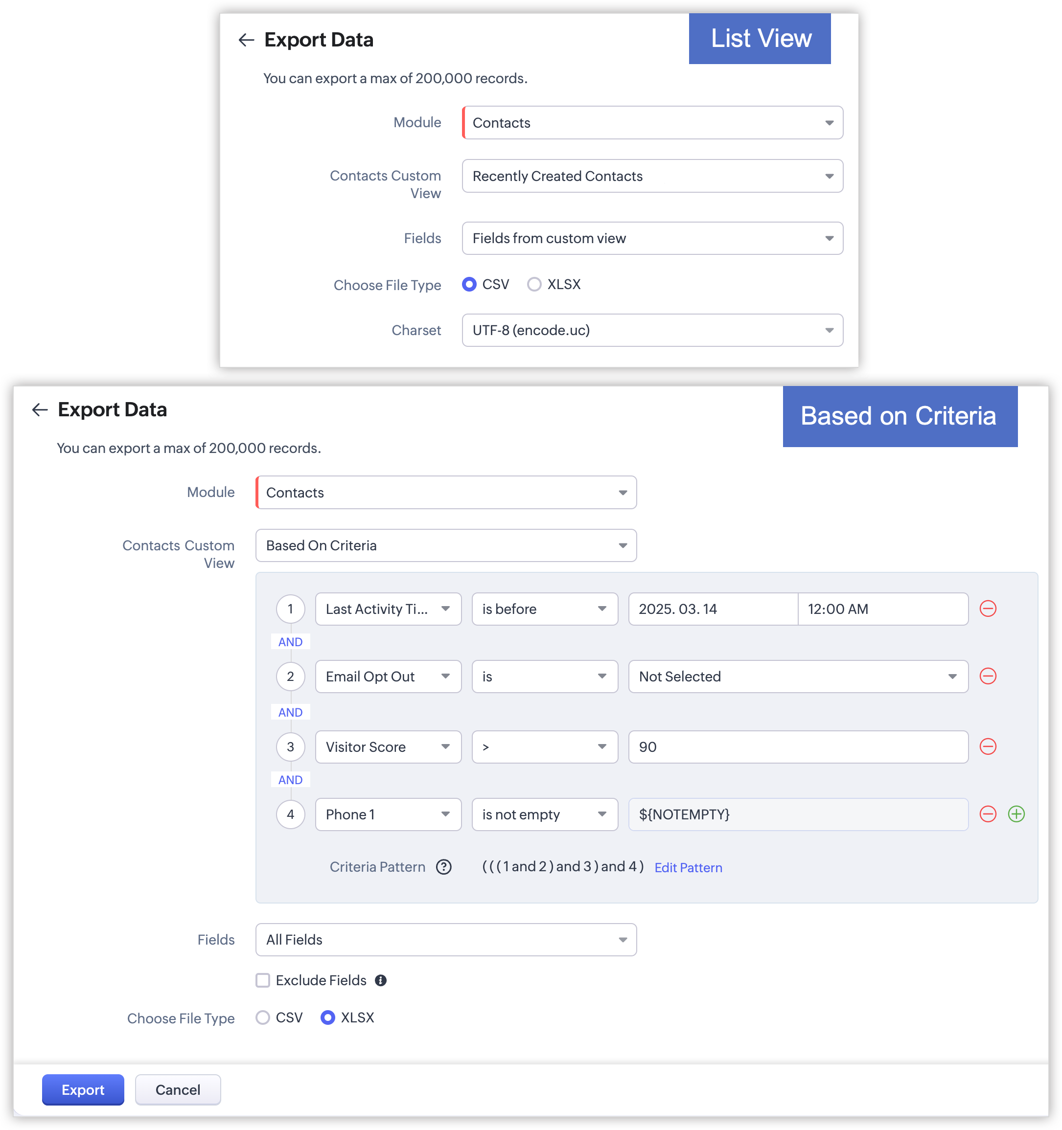 1. データの 作成日時 に基づくフィルター条件を設定し、複数に分けてデータをエクスポートできます。