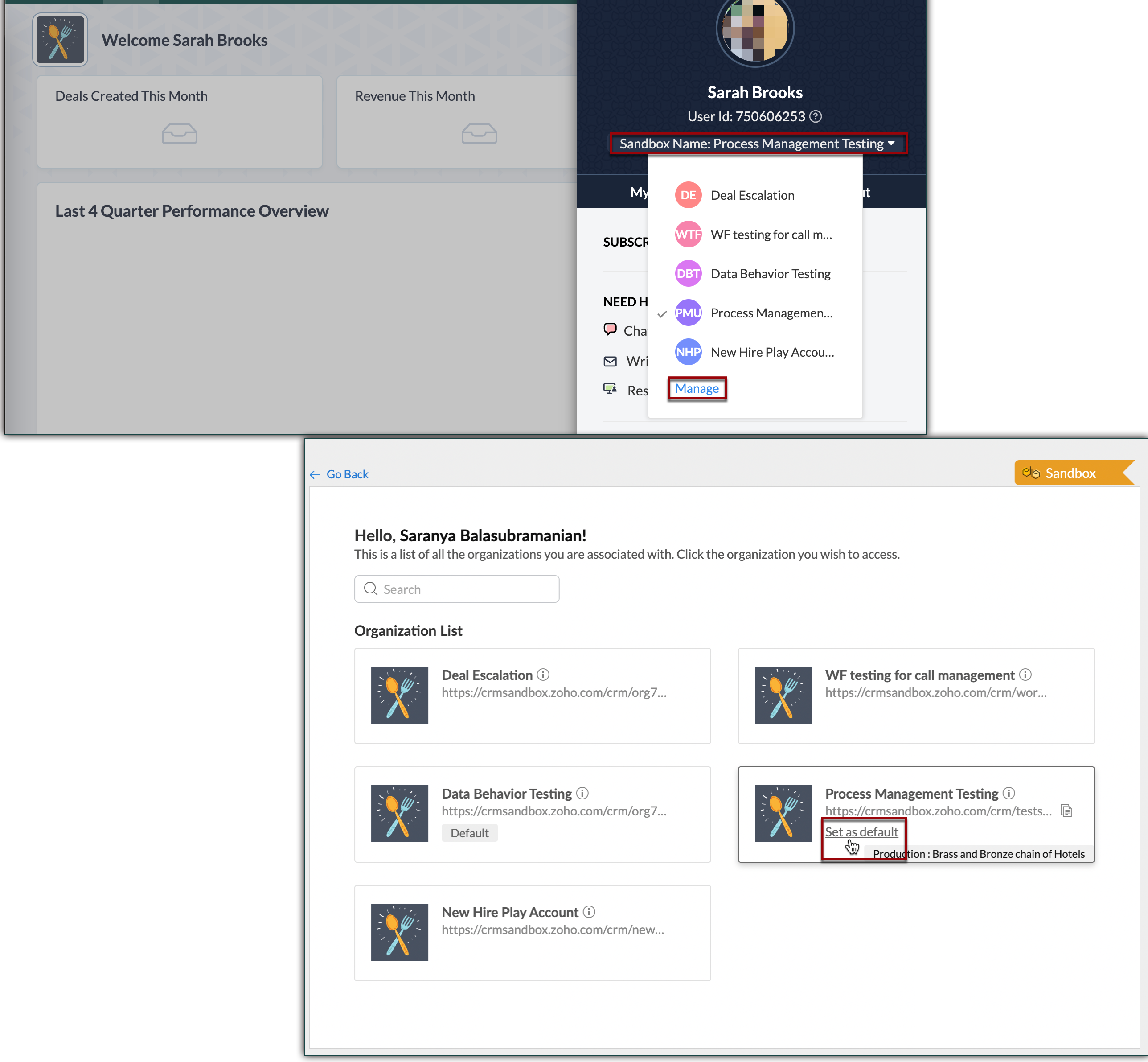 2. サンドボックスのドロップダウンをクリックして、 [管理] をクリックします。