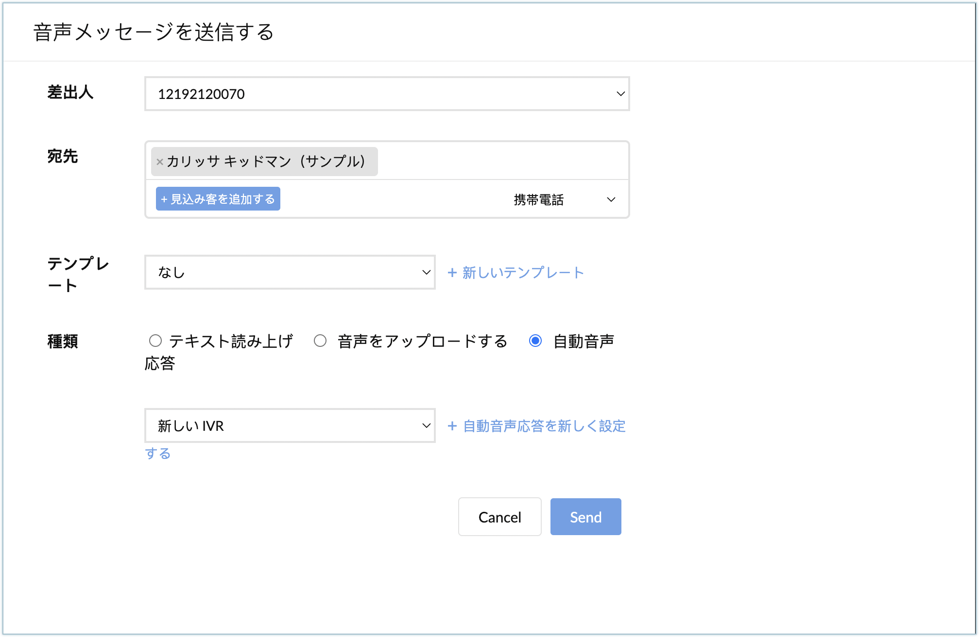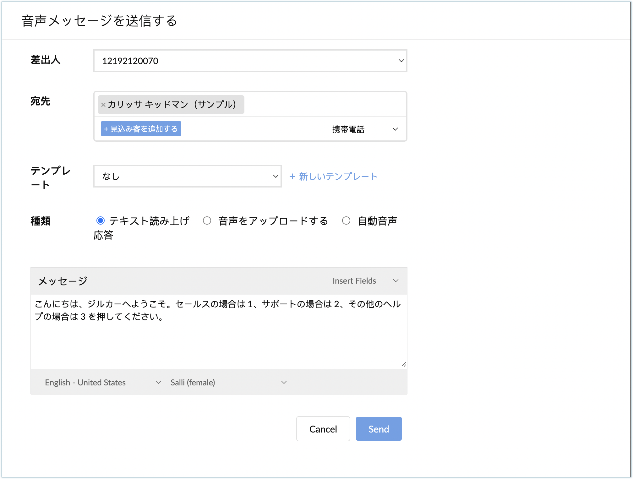 ボイスメッセージの送信:顧客にボイスメッセージを送信できます。Zoho CRM内の対応する項目(見込み客/連絡先)に詳細が反映されます。