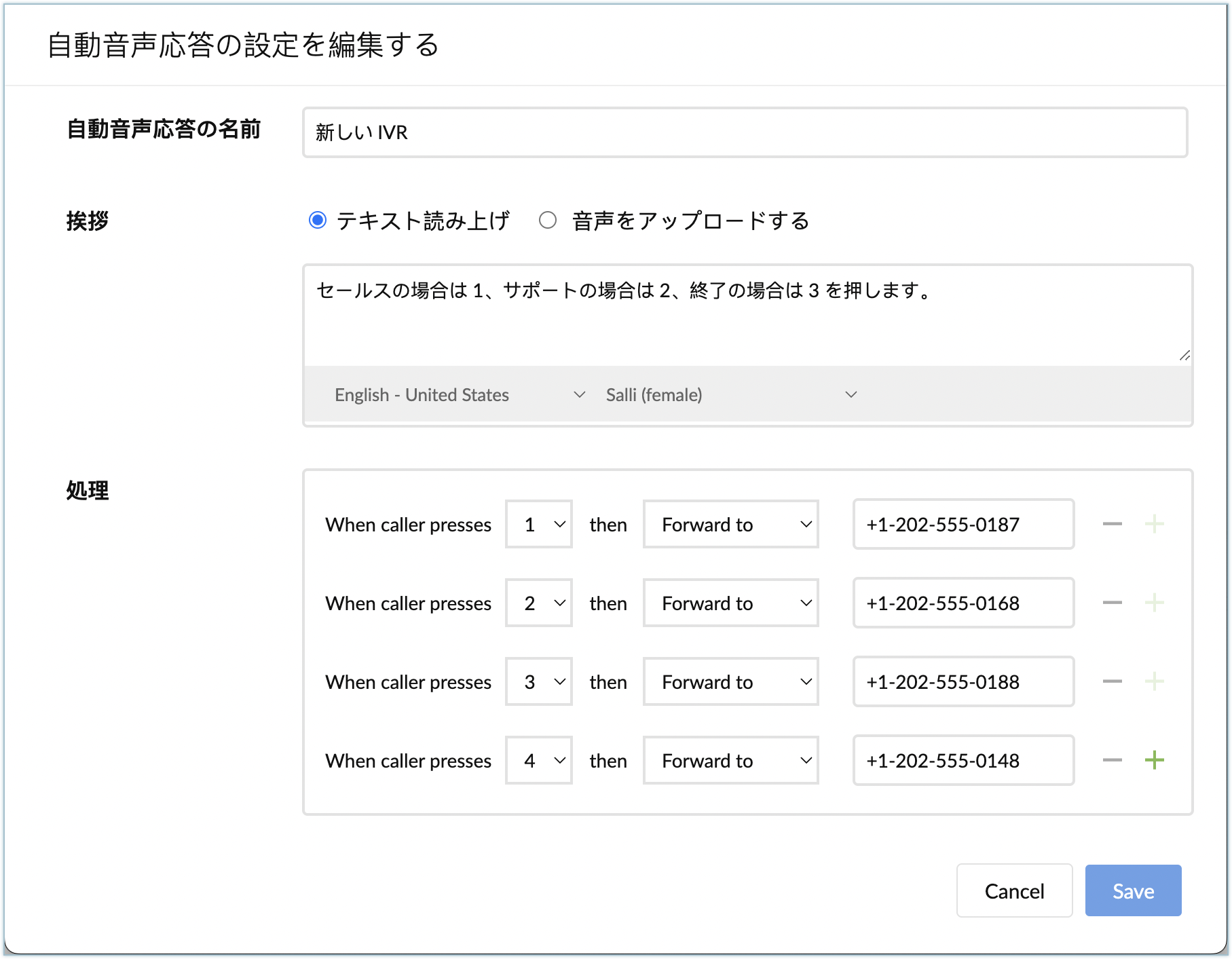 (受信通話用の)[IVR menu](IVRメニュー)オプションを使用して、希望するIVRメニューを対応する電話番号に関連付けします。