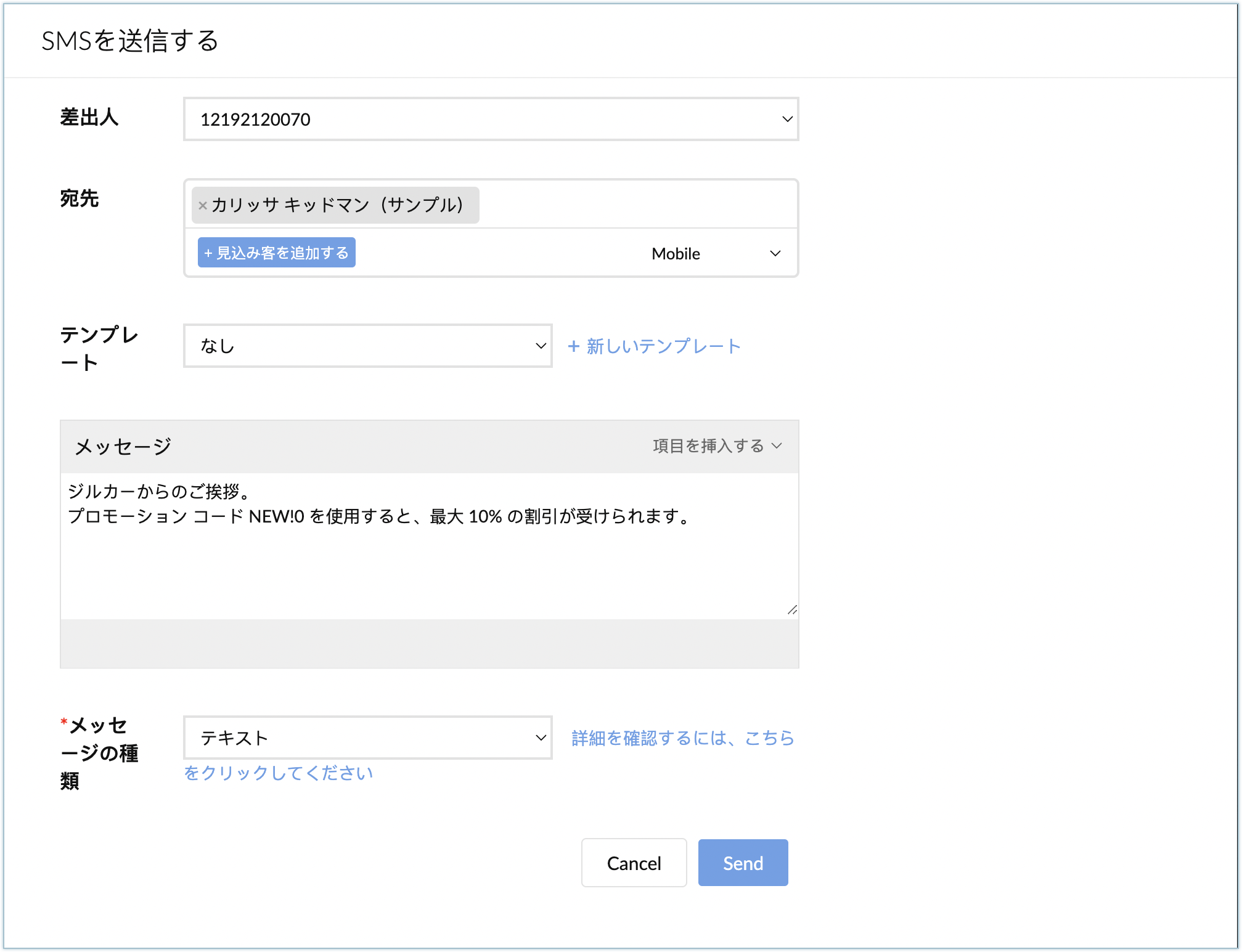 Zoho CRMのリストへのSMS送信:この連携により、Zoho CRMの[見込み客]、[連絡先]、[商談]などのタブにSMSを送信できます。