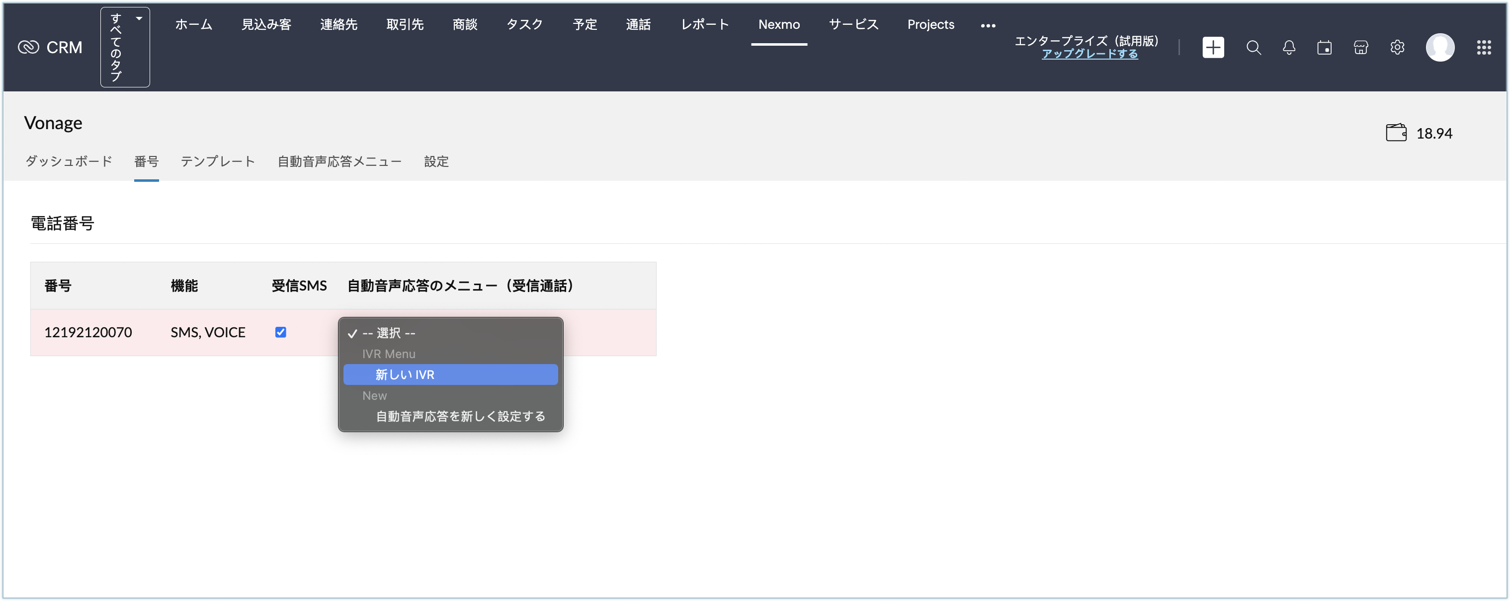 [Nexmo Extension Configuration](Nexmo拡張機能の設定)ページの[IVR menu](IVRメニュー)のサブタブをクリックします。