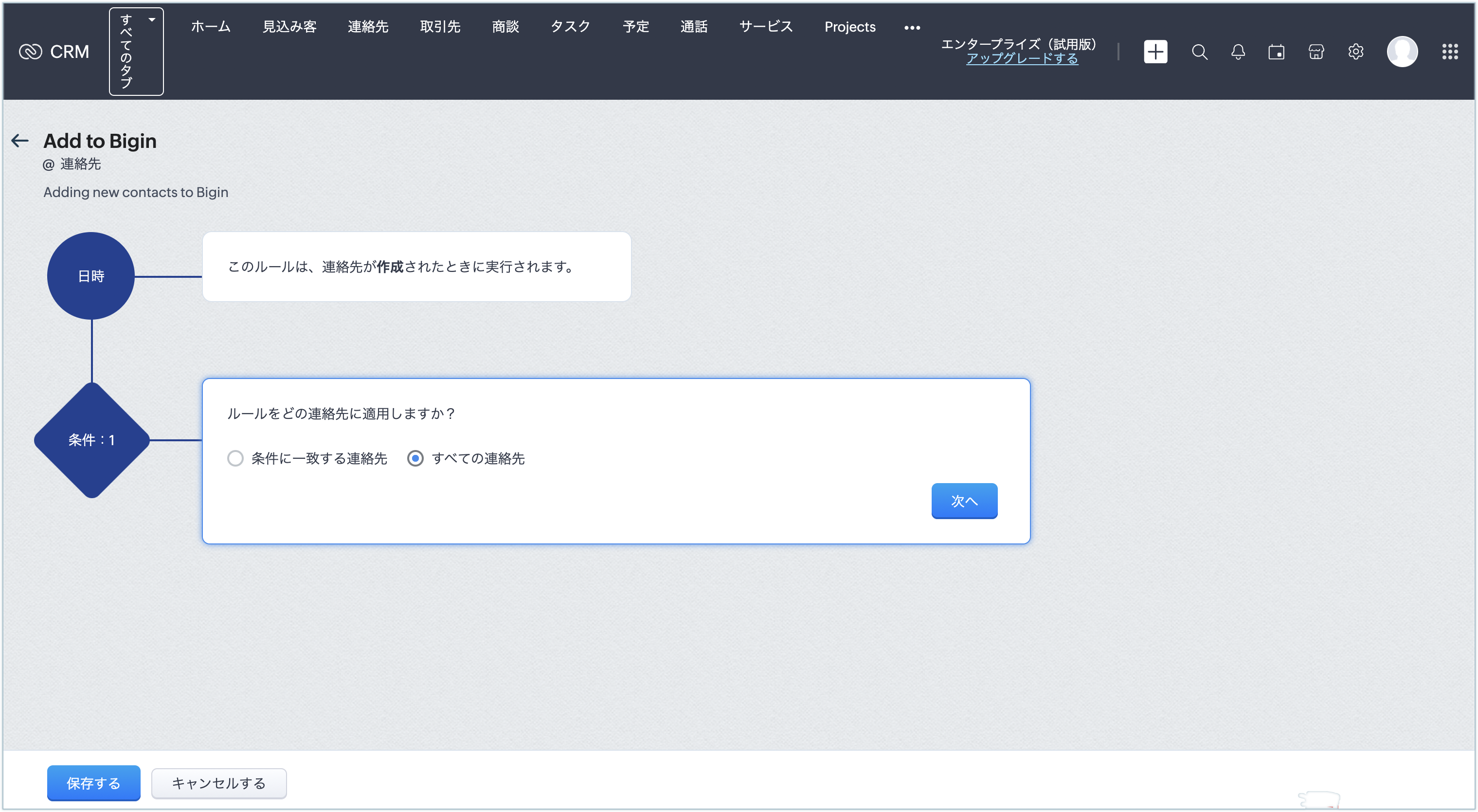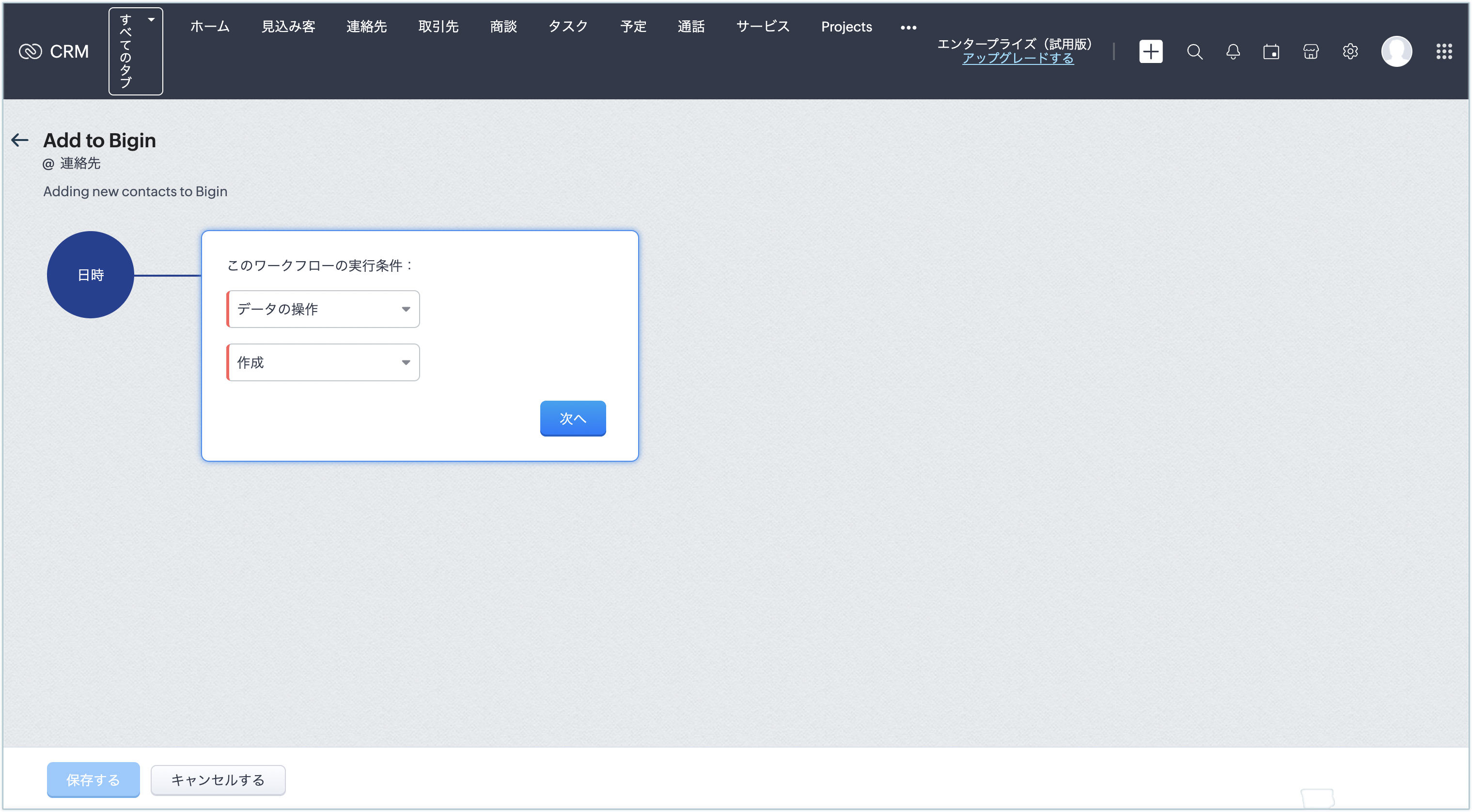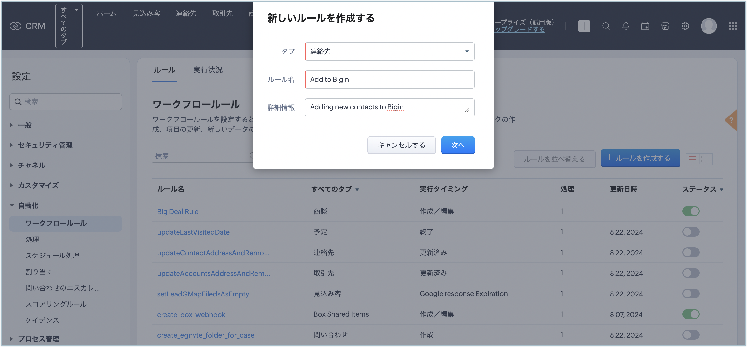 Zoho CRMでワークフロールールを設定することにより、Zoho CRMで新しく作成された連絡先、取引先、商談を、Zoho Biginに自動的に登録できます。ワークフロールールは、[連絡先]、[取引先]、[商談]のタブごとに個別に設定する必要があります。