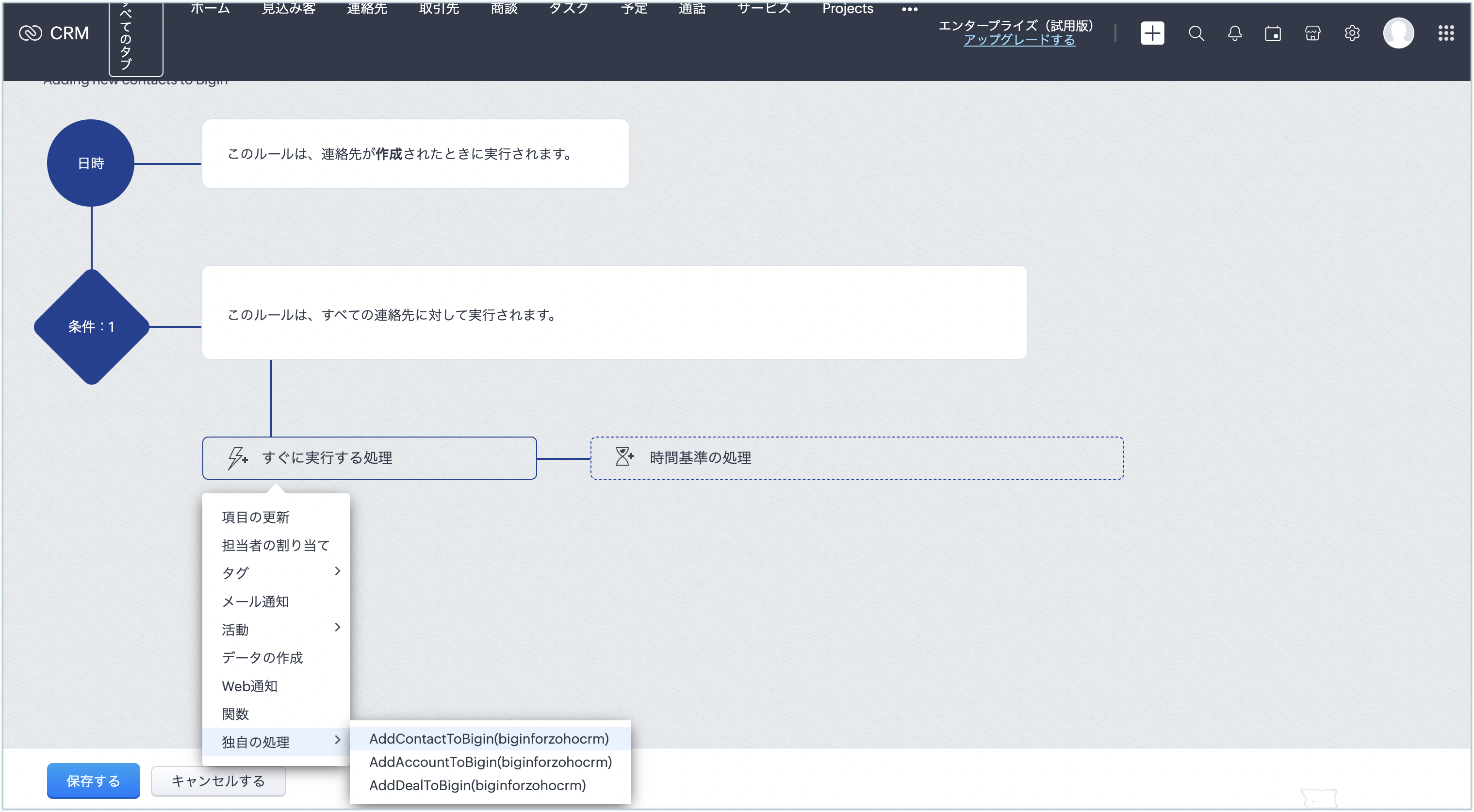 7. [すぐに実行する処理]をクリックし、[カスタム処理]→[Add Contact to Bigin](連絡先をZoho Biginに追加する)を選択します。