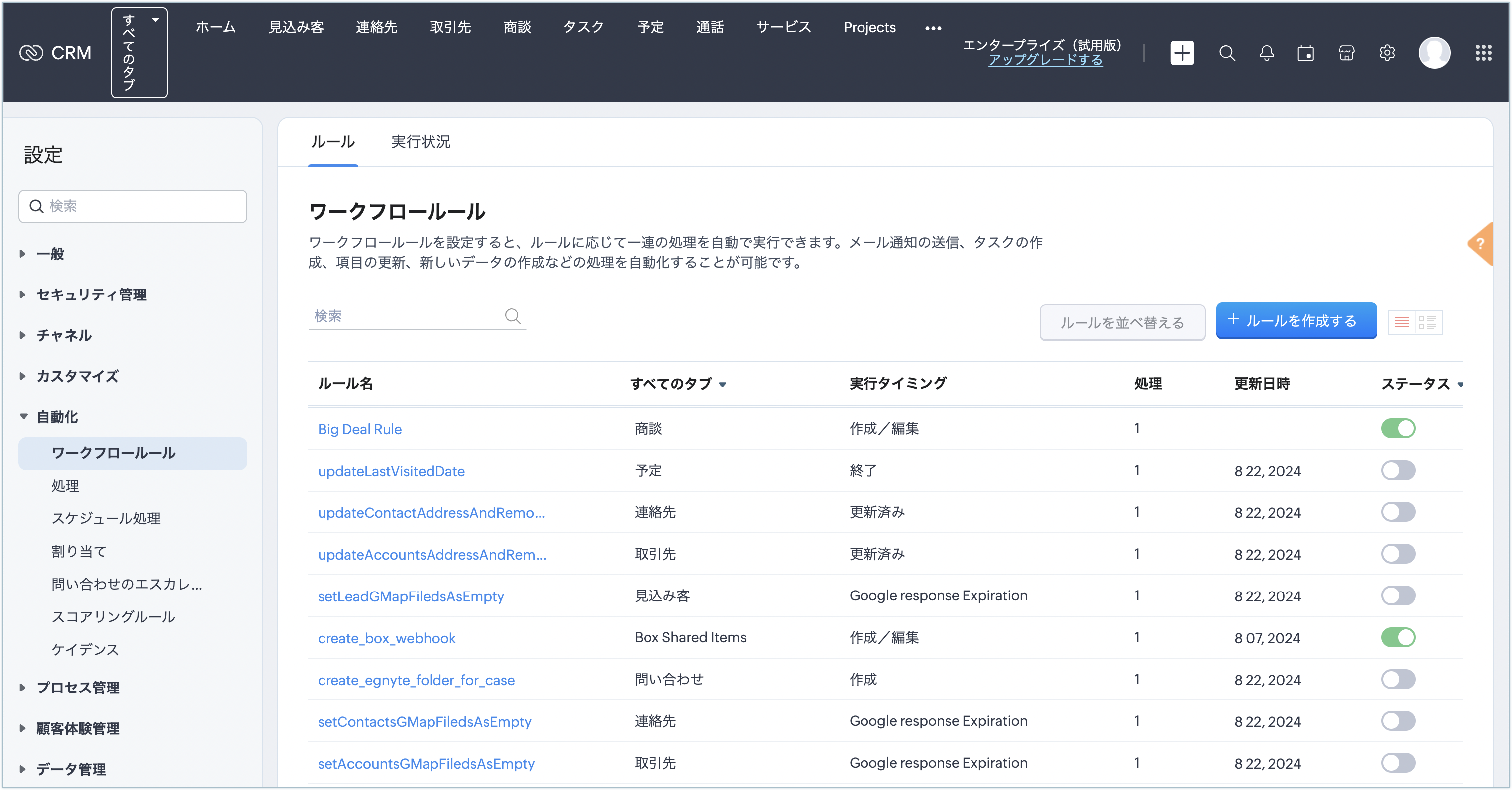 1. [設定]→[自動化]→[ワークフロールール]に移動します。