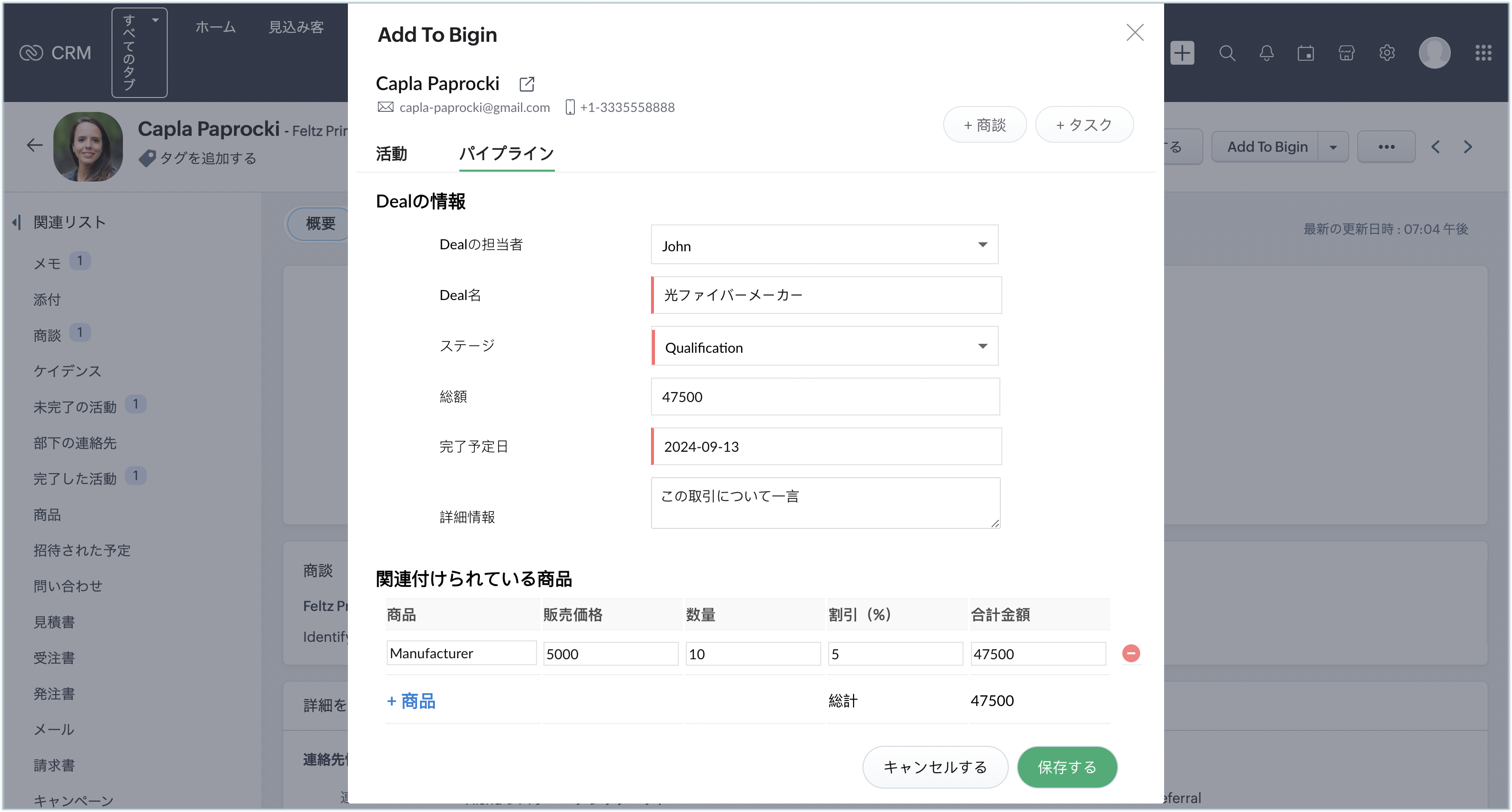 6. [Deals](商談)で必要な情報を入力して、[Save](保存する)をクリックします。
