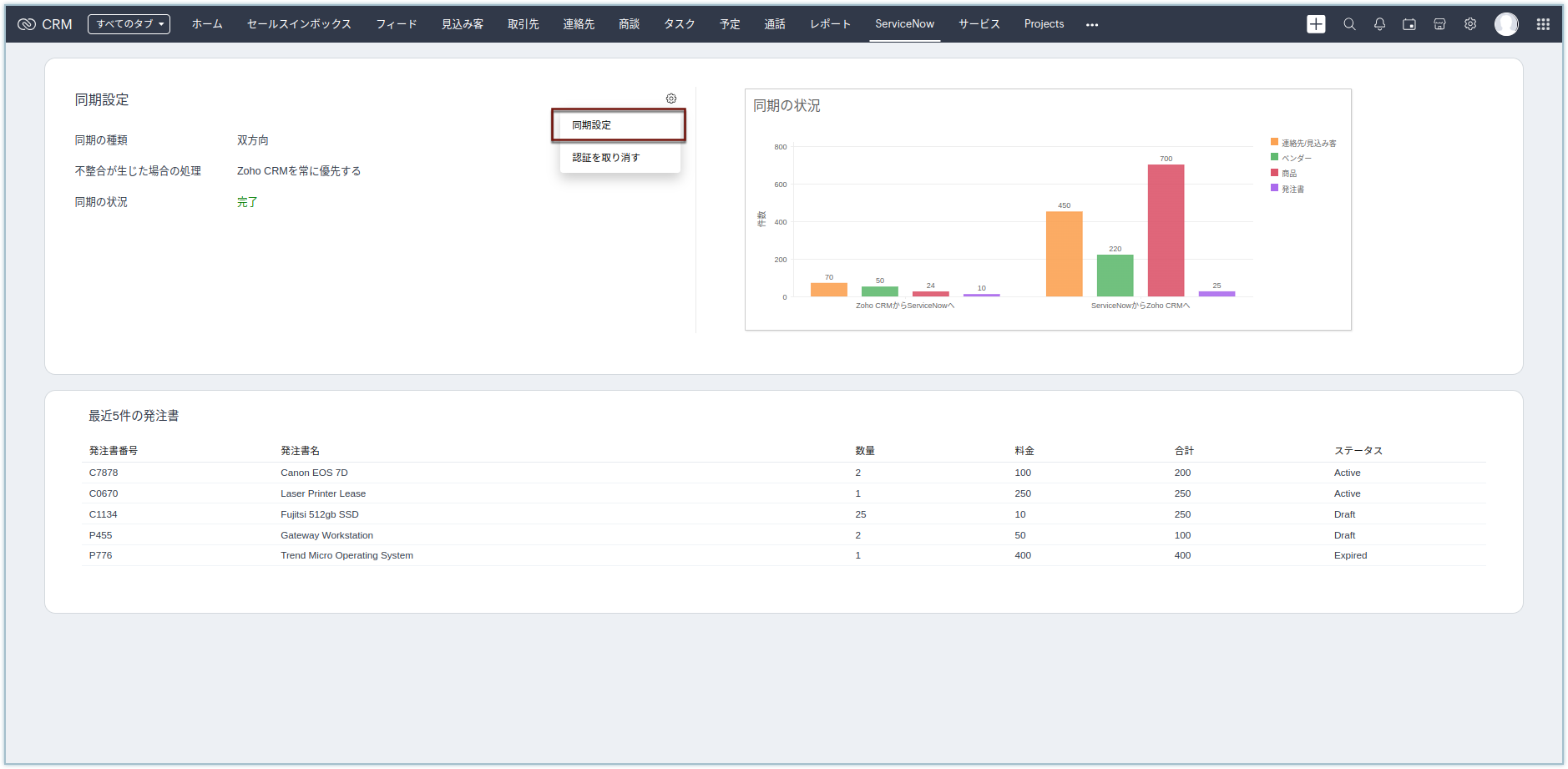 同期の詳細がダッシュボードに棒グラフで表示されます。同期の詳細と共に、最新の5件の発注書のデータも表示されます。