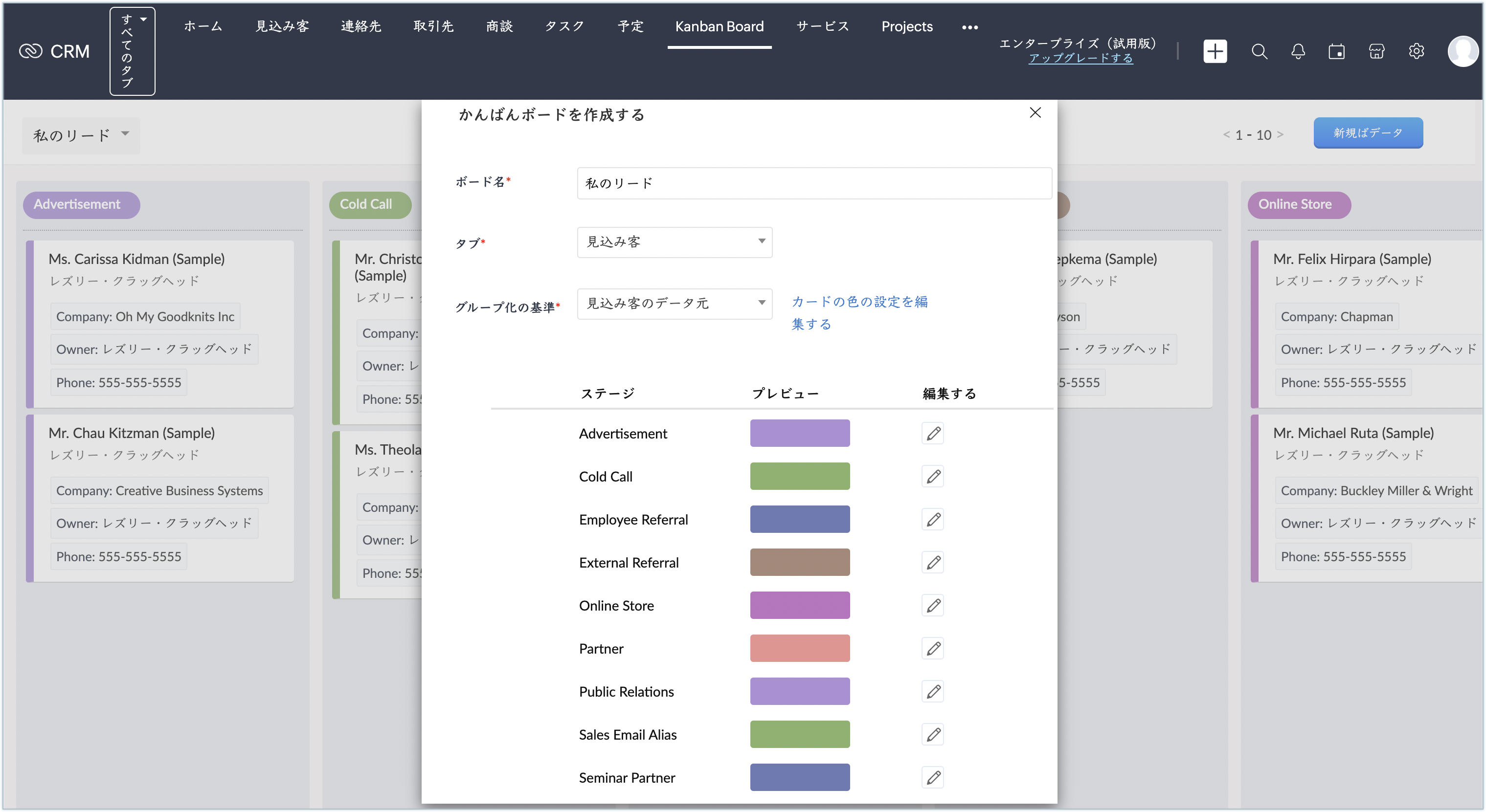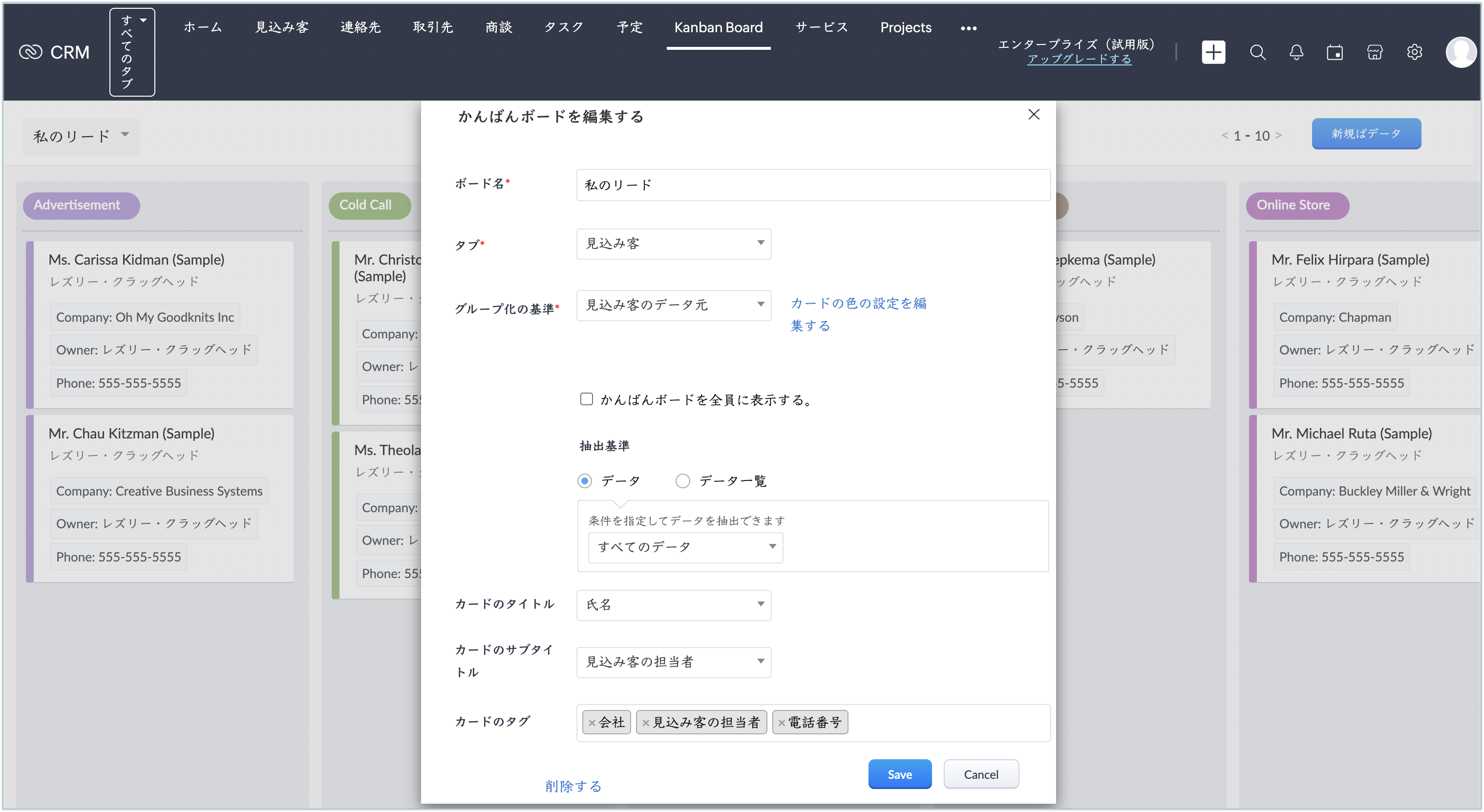かんばんボードを作成するには、対象のタブ、およびグループ化の基準にする選択リスト項目を選択します。たとえば、見込み客をフォローアップ状況別に表示するかんばんボードを作成する場合、対象のタブとして[見込み客]、グループ化の基準にする項目として[見込み客ステータス]を選択します。なお、ボードに表示する情報は、必要に応じてカスタマイズできます。