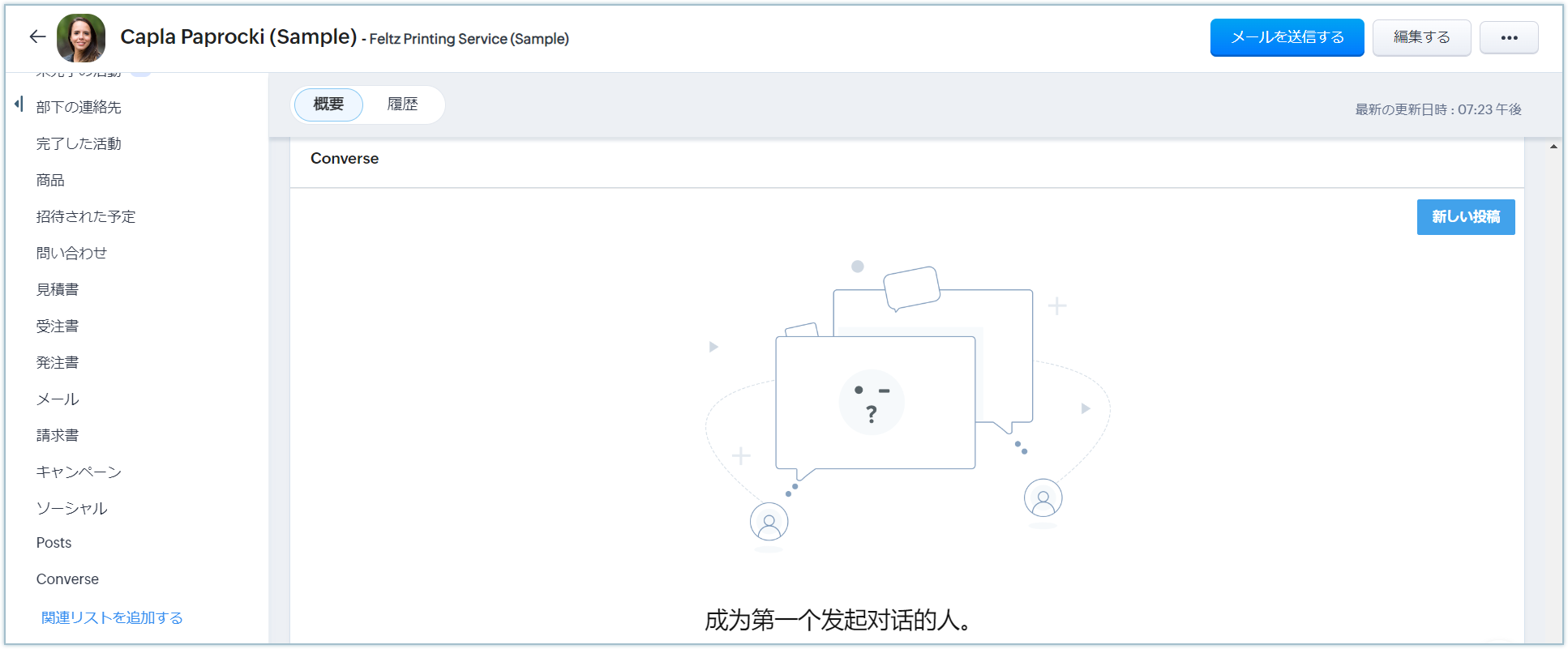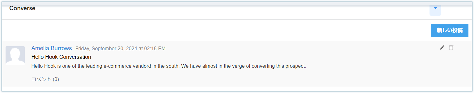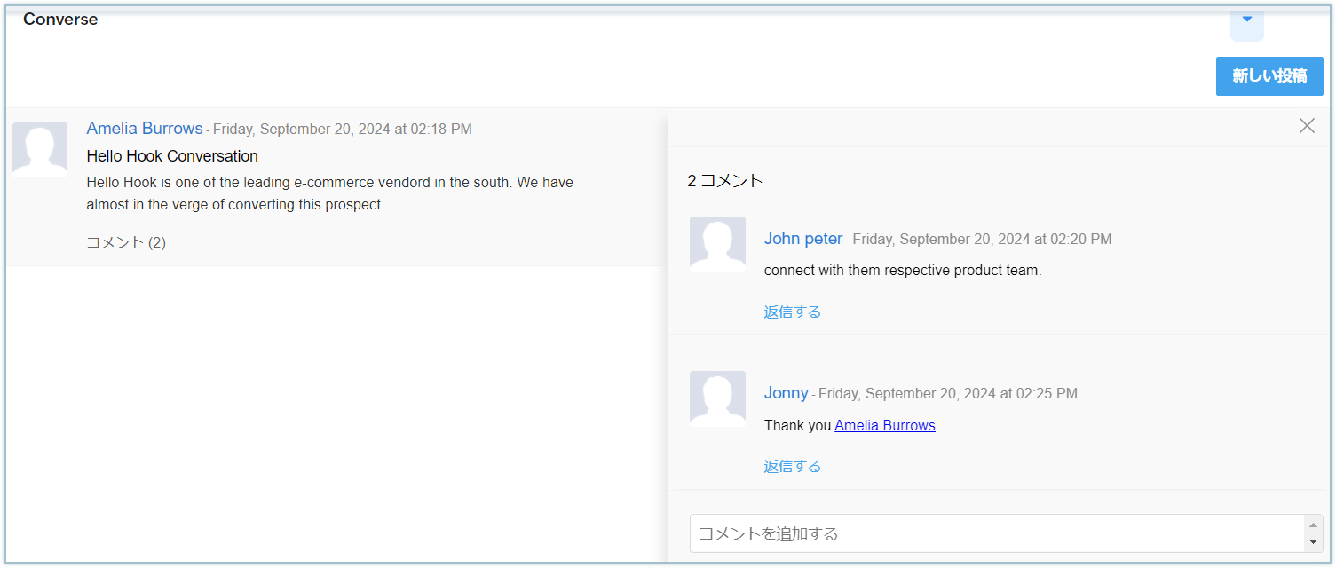 Zoho CRMでConverse拡張機能を利用すると、Zoho CRM内から投稿を作成し、コメントや返信を通じて他のユーザーと会話することができます。この拡張機能では、見込み客と連絡先に関する情報を、関連するチームメンバーと個別に共有することが可能です。