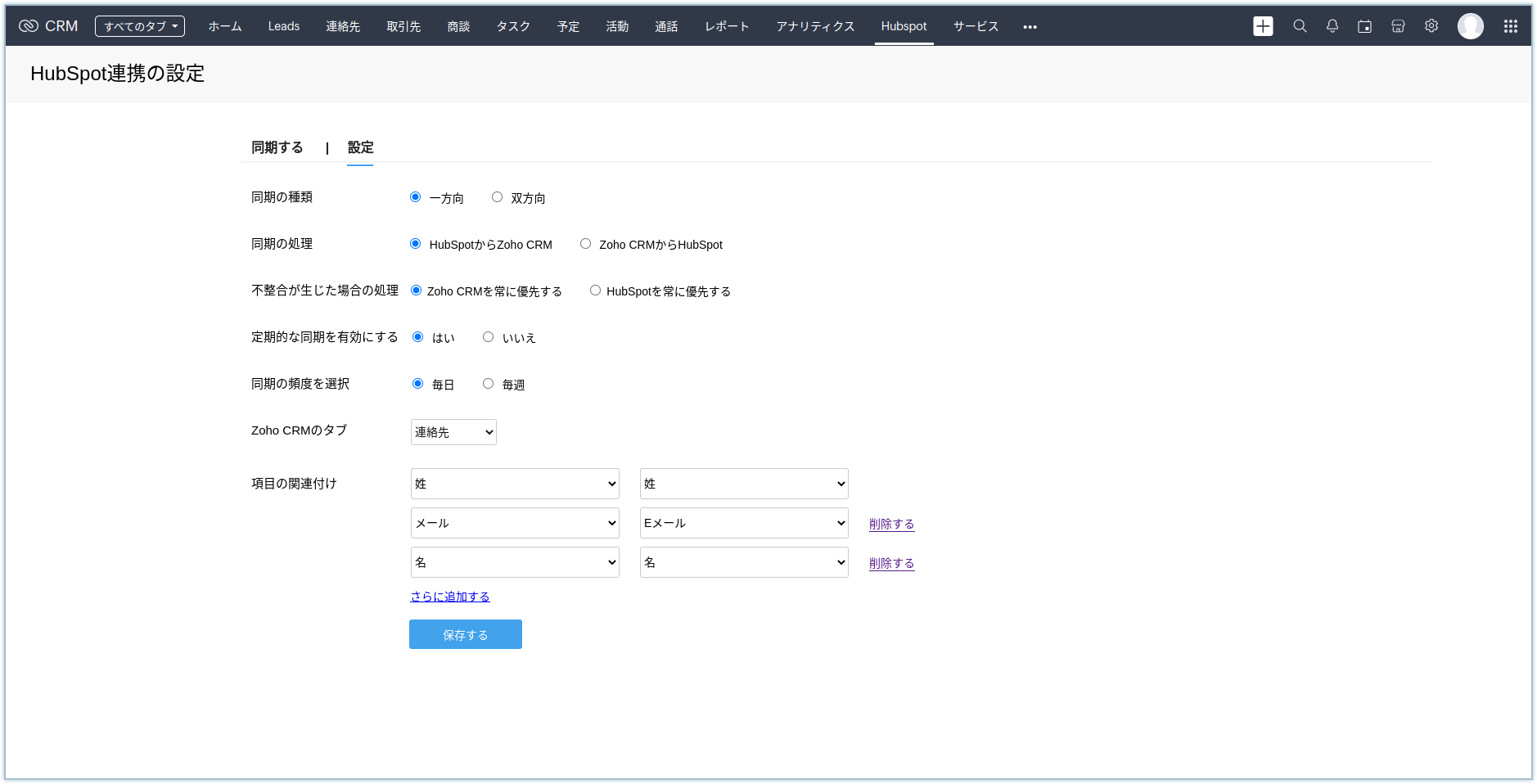 2. HubspotからZoho CRMへの同期設定:項目の関連付けで、姓の項目を必ず関連付ける必要があります(姓はZoho CRMでは必須です)。