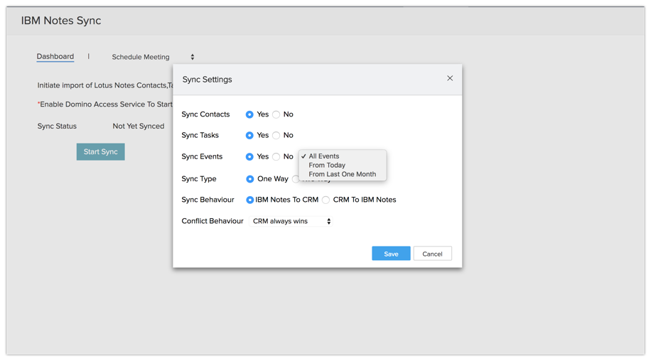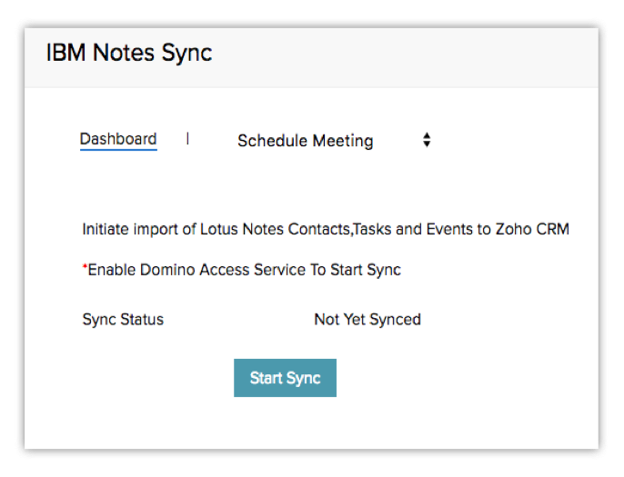 IBM Notes拡張機能を利用すると、IBM NotesとZoho CRMの間で連絡先、タスク、予定を同期できます。同期の方向としては、一方向(IBM NotesからZoho CRM、またはその逆)か、双方向のいずれかを選択できます。同期をスムーズに行うには、Dominoアクセスサービスを有効にする必要があります。