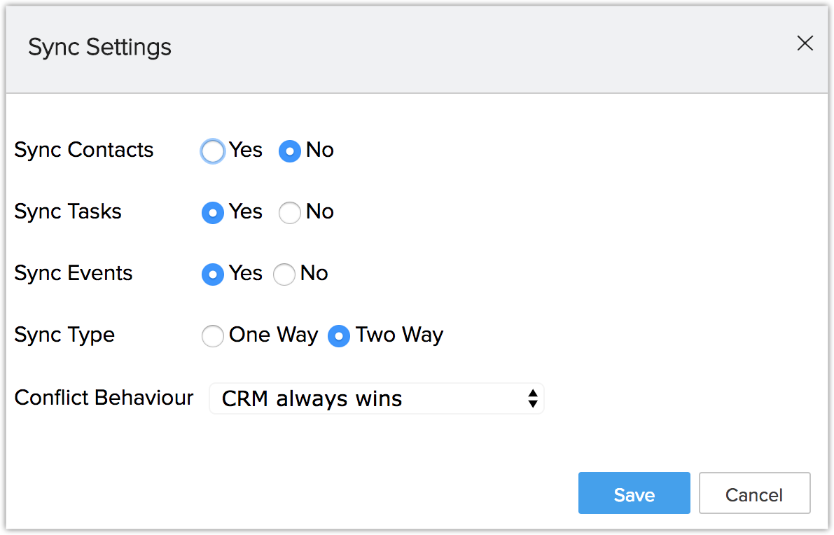 • [CRM always wins](Zoho CRMのデータを優先する):競合が発生した場合、Zoho CRMのデータが保持されます。
