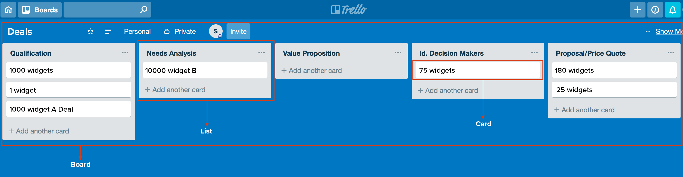 ボードを作成すると、CRMとTrello間でデータが同期されます。それぞれのボードで表示されるリストとカードは、次のとおりです: